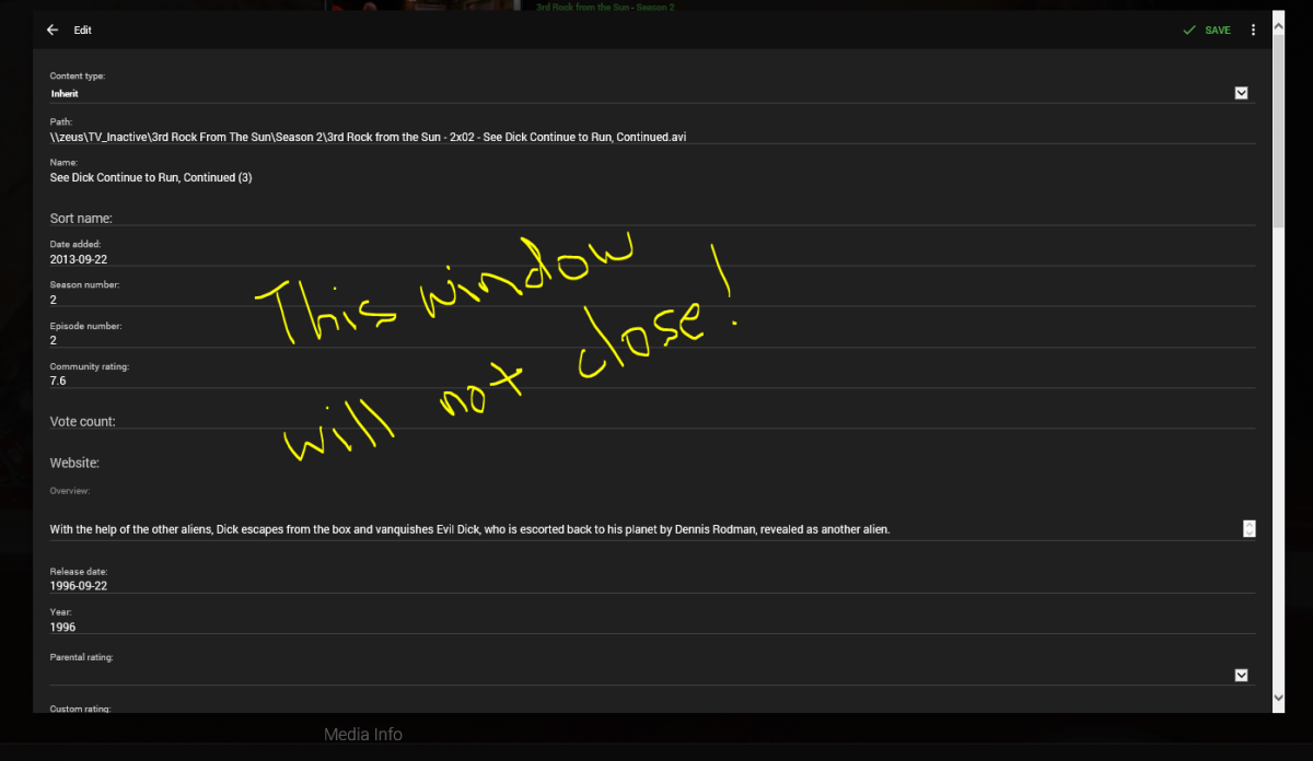 jellovator 14 Posted March 23, 2016 Posted March 23, 2016 This happens on the web client, both from the server and from client computers. Log into Emby, go to library, click on an item and choose the Edit option (like you're editing images or metadata or whatever) and it opens the Edit overlay window. When you click the Save button top right corner, the window stays open. Click the back arrow top left corner and the web browser navigates back one page. It's like instead of closing the window it's sending the backspace command to the browser window. The edit window will not close. You have to completely close the browser window and reopen. Happens in IE, chrome, and firefox. Server ver 3.0.5916 (but it's been happening in the past two updates as well)