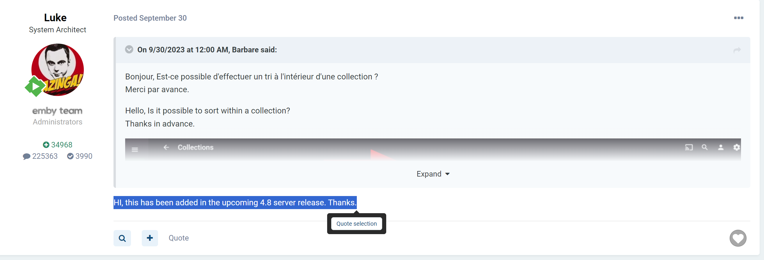 Luke 42077 Posted September 30, 2023 Posted September 30, 2023 4 hours ago, Barbare said: Bonjour, Est-ce possible d'effectuer un tri à l'intérieur d'une collection ? Merci par avance. Hello, Is it possible to sort within a collection? Thanks in advance. HI, this has been added in the upcoming 4.8 server release. Thanks.