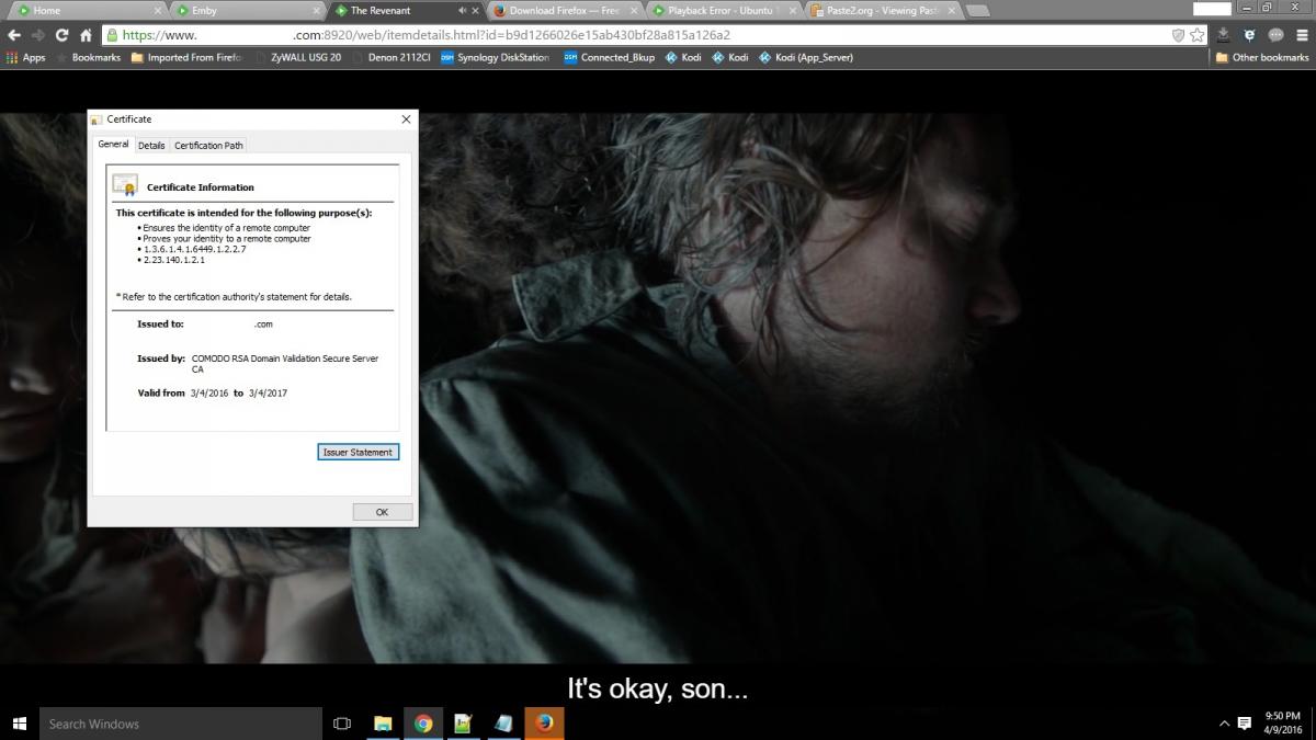 kcprophecy 3 Posted April 10, 2016 Author Posted April 10, 2016 Hey Luke, I imported the certificate but still no luck, Android see's it as a client certificate since it doesn't contain the CA attribute because it's not a self signed certificate. Here's a log from the Emby application on my phone, it isn't from the times from my original testing, but after I had tried importing the certificate and doing random tests. I tried removing the www from my dynamic DNS to have it match up exactly with the cn in the certificate, but no dice still. https://paste2.org/DnUfGZMO - Android Application Log Here's a screen shot of it also working on my computer after setting it back to www using Chrome connected over 8920. On this same computer though I get playback error if I use chrome to connect to my reverse proxy for Emby. Playback on firefox on the computer works through both my reverse proxy and port 8920. Sorry if it seems I am throwing a lot of different stuff at you guys but just trying to provide as many pieces as I can in hopes of fixing it. My main thing is just getting a working Emby Android application. I'd really like to keep SSL enabled for the application if possible so any assistance you guys can provide would be much appreciated.