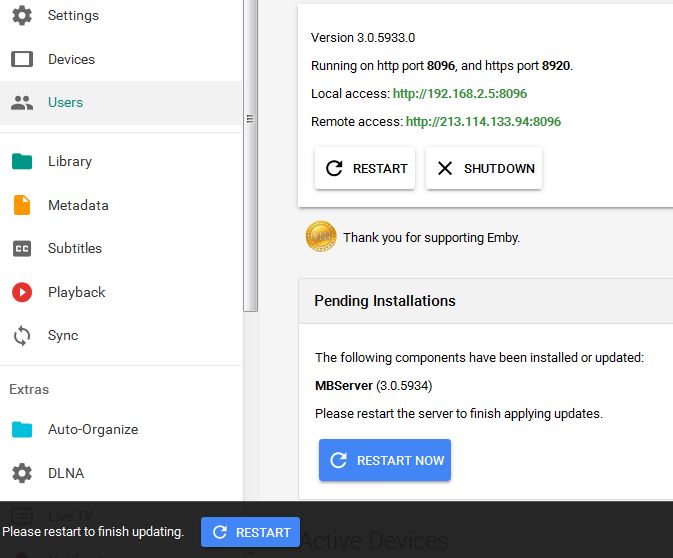 Dibbes 514 Posted May 2, 2016 Posted May 2, 2016 (edited) So once in a while I'm having this same issue. It's usually a file that still locked for some reason. The workaround: - Exit the Emby server (or stop the service) - browse to C:\users\<your username>\AppData\Roaming\Emby-Server\ - rename the system folder to system.old - browse to http://emby.media/download.html - download and install from there Edited May 2, 2016 by Dibbes