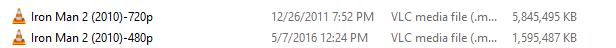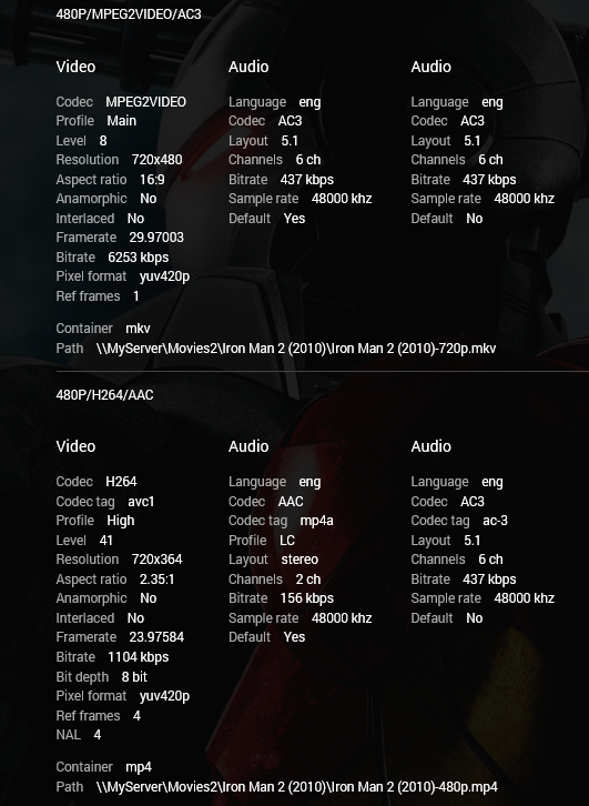 legallink 187 Posted May 10, 2016 Author Posted May 10, 2016 Exactly that is my point, you are mixing MP4 and MPEG types, in the naming convention it says: What you have: Iron Man (2008)-480p.mp4 Iron man (2008)-720p.mpeg Since one is a .mp4 and the other a .mpeg I suspect EMBY is seeing them as two different files. If you delete the low res 480p version you will be fine. No, that is not how the naming convention works. You are supposed to be able to mix file types.