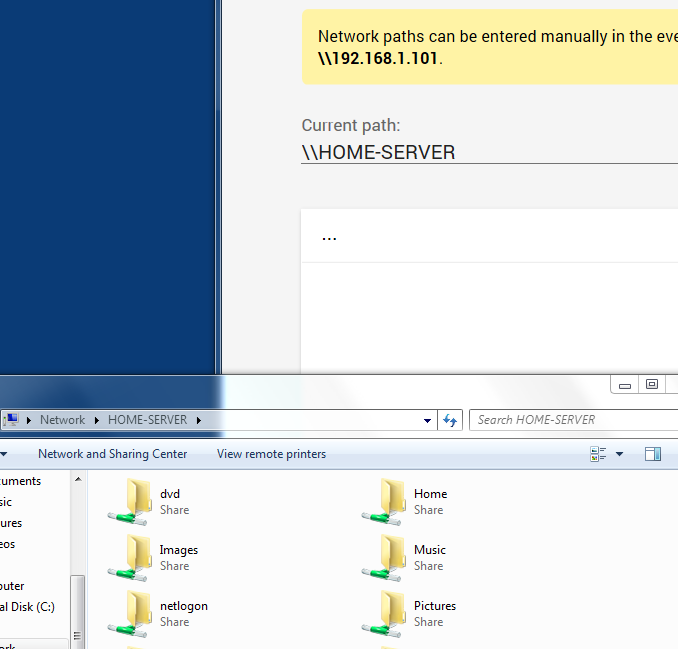bflagg 2 Posted June 15, 2016 Posted June 15, 2016 Cannot access library shares on windows server. Yet..I can browse to them with Network browsing or direct UNC paths ..Server 2012 (domain setup) Client Win7 x64 (not joined to domain). MCE and windows can access UNC paths fine and use them no problem. Emby cannot see the shares for that server.. (\\home-server\movies is a valid UNC path and can write to share) Attachment shows emby cannot view shares, but windows shows it can... Is there any help?