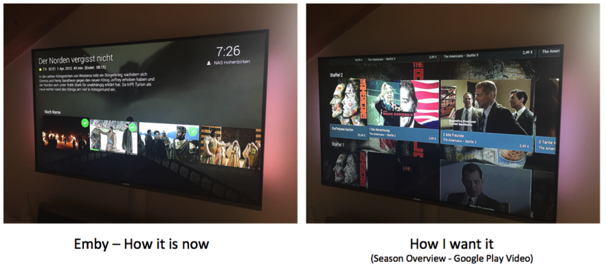 Michael_Schmitz 7 Posted June 21, 2016 Author Posted June 21, 2016 (edited) So, I made some screenshots from my emby app on android TV/Shield What I want to express is, that from my point of view (I am not a designer and not a developer) I find the Emby app has some inconsistencies when using different views on different contents. Some Screens have leanback designs, some are not. I compared the actual Emby screens with other apps and the leanback library to make it clearer. From my perspective some screens are so packed with content that makes me loose orientation and hinders the optimal user experience for me: First: The detail screen of a movie. I hope you understand what I mean. I gives to me more focus on the information and helps me better to navigate through the content Second: TV-Shows: The Season overview: In Emby I have first have to click on the picture to get the information. In comparison to that the Picture with its title and short description (on google play video) helps me better select what I want to see Third: Documentaries Overview: I have a vertical scrolling and alle Picture are jam packed next to each other. I am totally loosing orientation. The Grid from the leanback library seems to be a better solution. The Same with Movies or Music Videos. I am not sure, what is possible. Maybe you say, that the Information, that is stored in the emby server database, makes it difficult to display on the Screens. But you would do me a great favour if you explain the differences to me or what would be even better, tell me that you might think about that in future versions ;-) Thx a lot in advance Best Michael Edited June 21, 2016 by Michael_Schmitz