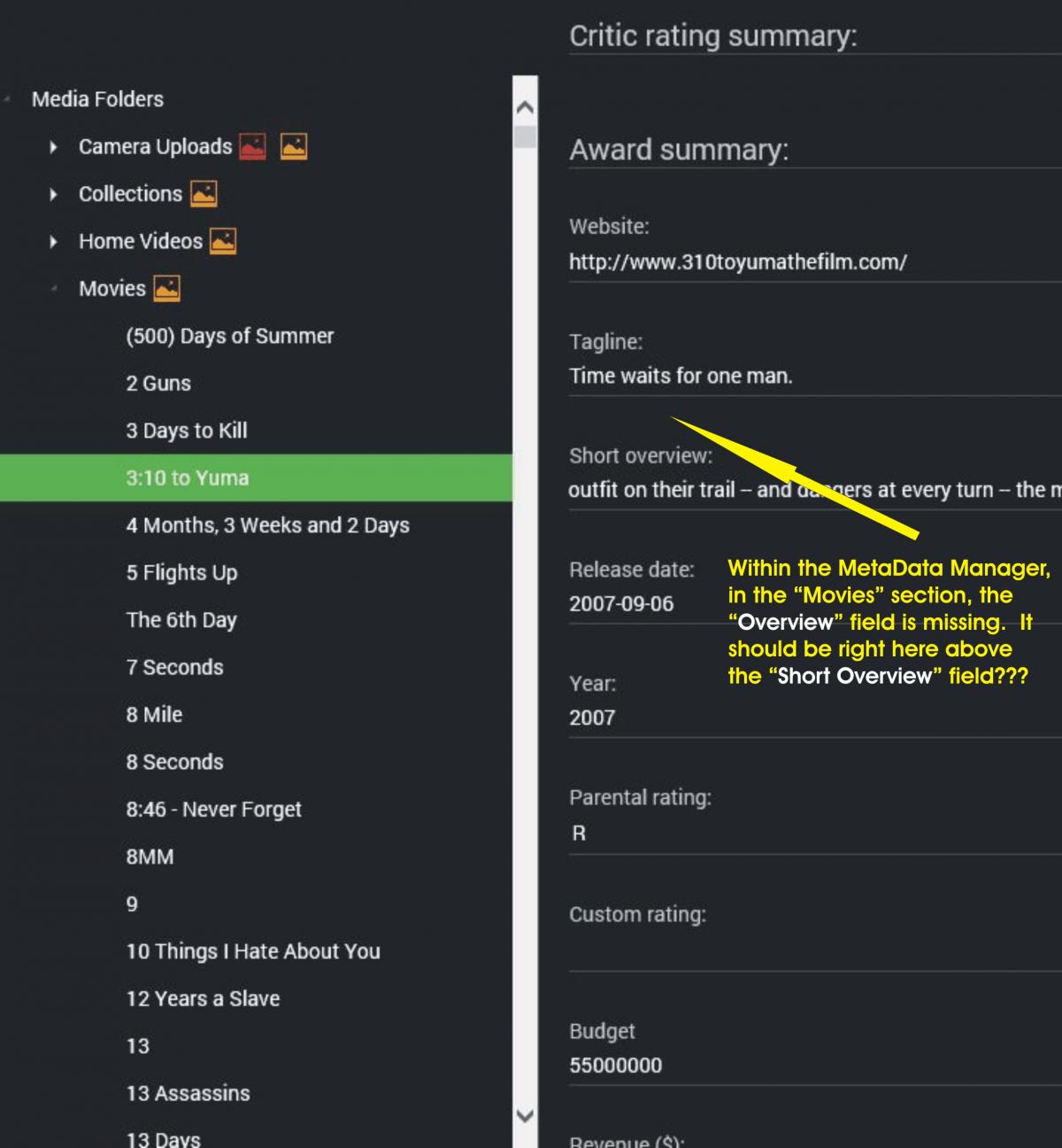 MarcusJ 18 Posted June 24, 2016 Author Posted June 24, 2016 Within the Metadata Manager - I was trying to edit the metadata for my movie library. I noticed that the entire field called "Overview" was missing. I am attaching a screen shot. Thanks!