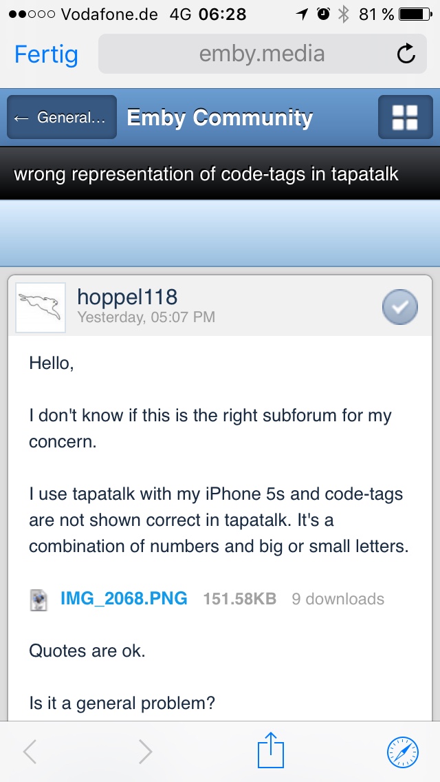 hoppel118 37 Posted August 1, 2016 Posted August 1, 2016 (edited) Hello, I don't know if this is the right subforum for my concern. I use tapatalk with my iPhone 5s and code-tags are not shown correct in tapatalk. It's a combination of numbers and big or small letters. Quotes are ok. Is it a general problem? Greetings Hoppel Edited August 1, 2016 by hoppel118 1