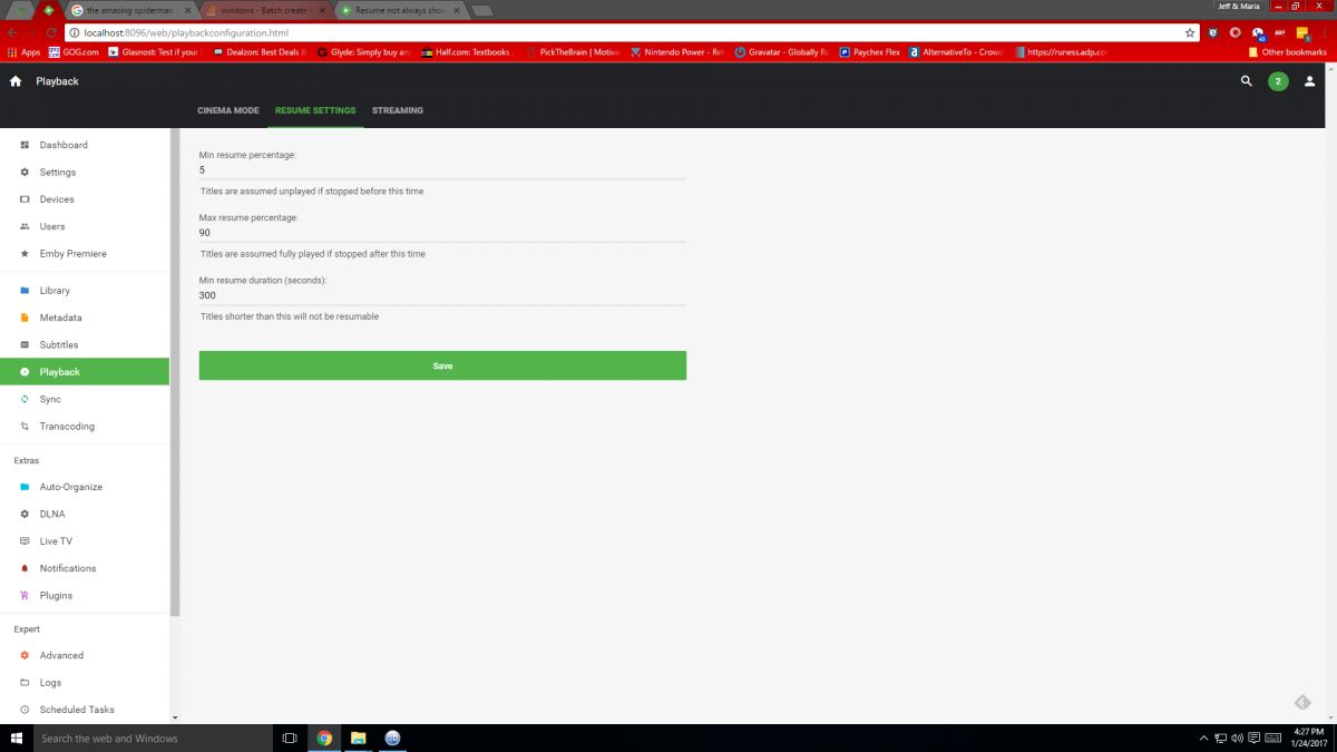 xXSagaiaXx 25 Posted January 24, 2017 Author Posted January 24, 2017 The data is not anywhere you can easily see it. What is the reported length of the item you were last trying? Can you show the media info for it from the web client? Also, what are your resume settings under Dashboard->Playback->Resume Settings? Attached screenshots for your questions