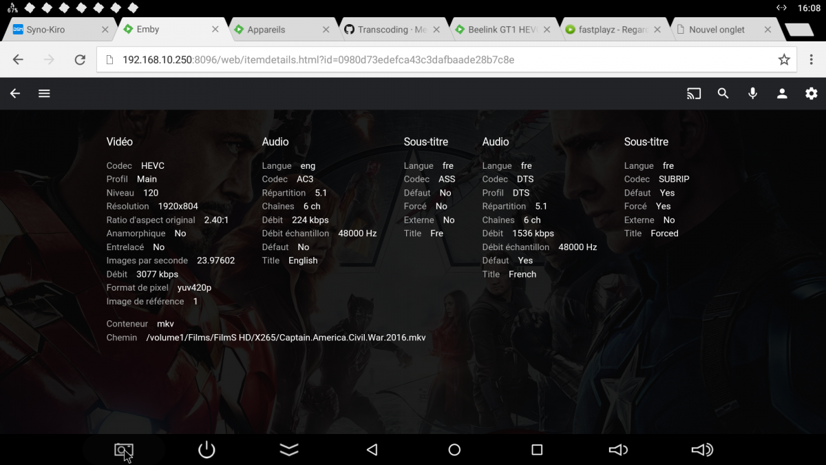 Kiroha 1 Posted September 14, 2016 Author Posted September 14, 2016 Thx it's done Exactly what you were doing and what happened. Include the name of whatever you played if it is a playback problem : Play Captain America Civil War Video ID : 1 Format : HEVC Format/Info : High Efficiency Video Coding Format profile : Main@L4@Main Codec ID : V_MPEGH/ISO/HEVC Duration : 2h 27mn Bit rate : 4 003 Kbps Width : 1 920 pixels Height : 804 pixels Display aspect ratio : 2.40:1 Frame rate mode : Constant Frame rate : 23.976 (24000/1001) fps Color space : YUV Chroma subsampling : 4:2:0 Bit depth : 8 bits Bits/(Pixel*Frame) : 0.108 Stream size : 4.13 GiB (66%) Default : Yes Forced : No Color range : Limited Color primaries : BT.709 Transfer characteristics : BT.709 Matrix coefficients : BT.709 Audio ID : 2 Format : DTS Format/Info : Digital Theater Systems Format profile : HRA / Core Mode : 16 Format settings, Endianness : Big Codec ID : A_DTS Duration : 2h 27mn Bit rate mode : Constant Bit rate : 2 046 Kbps / 1 509 Kbps Channel(s) : 6 channels Channel positions : Front: L C R, Side: L R, LFE Sampling rate : 48.0 KHz Frame rate : 93.750 fps (512 spf) Bit depth : 24 bits Compression mode : Lossy Stream size : 2.11 GiB (34%) Title : TrueFrench DTS-HD High Resolution 5.1 @2046kbps 24 bits Language : French Default : Yes Forced : No Any options you have changed from their default settings => No option change The time you sent the log => 22h43 GTM +1 Paris The name of the Emby user on the local server that was logged in at the time => Kiroha