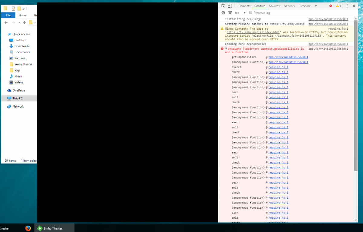 r0bot 1 Posted December 6, 2016 Posted December 6, 2016 Hey all, I have read through all the threads on here about the Black Screen issue (3 on the front page of the forums right now) but nothing has solved my issue. Hoping that I can get Luke to stop by this thread and help me out. Fresh Windows 10 install, fully up to date. Emby Theater from GitHub extracted to C: root Turned on debugg logging for Emby Theater and attached, also enabled the developer console for electron and have errors shown. theater-63616629024.txt