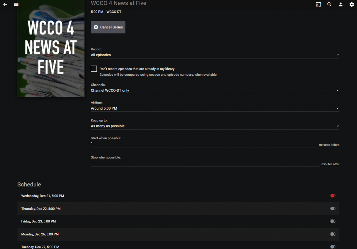 jnels 0 Posted December 21, 2016 Posted December 21, 2016 Emby Version: 3.1.0 O/S: Windows 7 Schedules Direct Guide Information It seems like something has changed with how the server is scheduling recordings for daily series. As an example I just created a series to record the nightly news at 5:00 PM. Only the first episode (the one today) is scheduled with the rest of the episodes showing up but seemingly inactive. I am attaching the part of the log file from when I selected the series to be recorded. Also, a screen capture showing the active and inactive recordings for the series This was working last week but Emby server was updated to version 3.1.0 on 12/18. The last daily recordings worked on 12/19 and then the episodes stopped recording. logfilecreateseries.txt