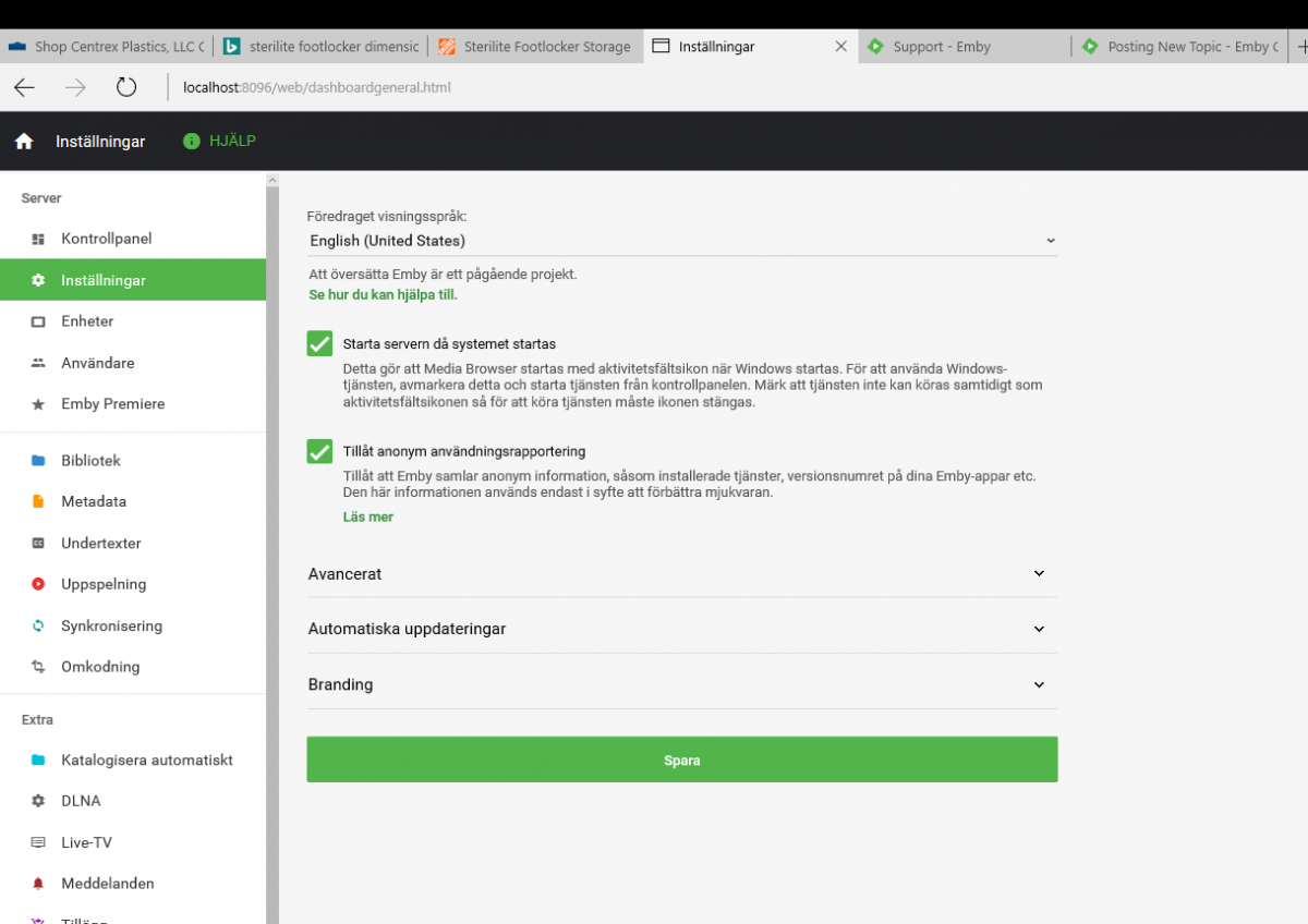 h8n01 0 Posted December 26, 2016 Posted December 26, 2016 Emby Server no longer pays attention to the language I have selected. Regardless of which language I select and how many times I click Save (Spara), the language remains as, what appears to be, Dutch. Has anyone seen this or does anyone know what config file I can manually modify to get it to switch back to English. I'm running version 3.1.1.0.
