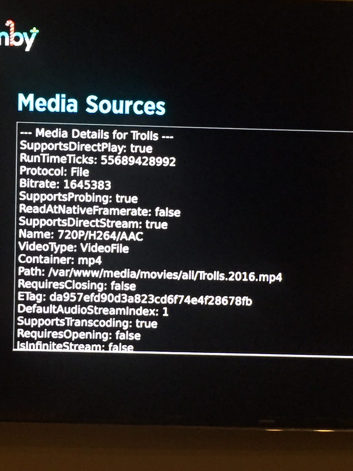 weas98 0 Posted January 20, 2017 Author Posted January 20, 2017 @@speechles - I attached all the information from the blue neon Emby app. Also if I force direct stream movie plays at correct speed without sound. Forcing direct play and transcode play in Fast Forward. Sent from my iPhone using Tapatalk