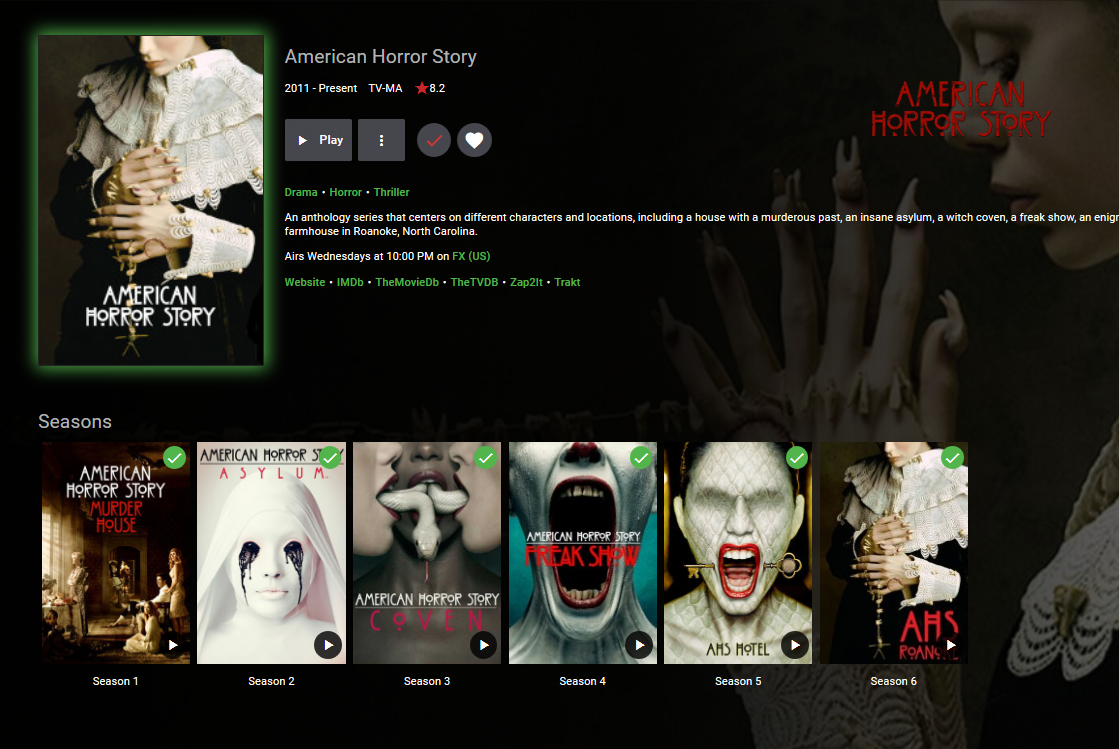 Spyderturbo007 19 Posted January 29, 2017 Author Posted January 29, 2017 (edited) Thanks Luke. I just found that in another thread. Is there a way to get it to use the existing artwork? Also, it doesn't appear to be finding everything. Log attached. For example, I refreshed American Horror Story. Here is the initial screenshot prior to using the Refresh: Here is what was in the directory after the refresh. Notice that it's missing the images for Season 01, 02 & 03. If I manually open Season 03 and hit Refresh, it will load the image. Log.txt Edited January 29, 2017 by Spyderturbo007