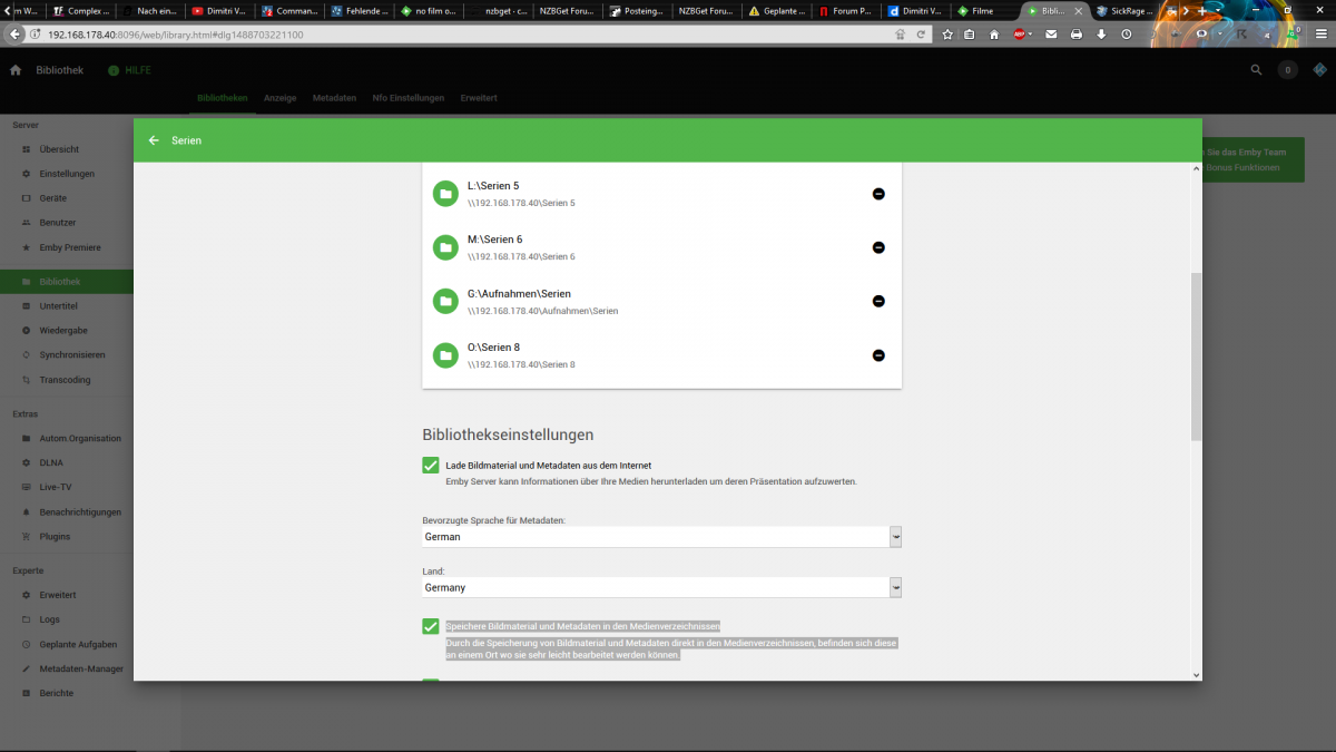 Kodi_Newcomer 27 Posted March 5, 2017 Posted March 5, 2017 (edited) Hello Com, I'm hanging out here. I have notice the same problem. Many Posters are lost, a manual update dont work. I have to do a manual image search and select one, after this i type F5 and the poster is there. Hi, have you enabled saving of local metadata within media folders? And yes for me i use this option. Luke I am trying to locate this setting but can't find it Is it possible to make a screenshot of it? I'm running this version Look at your tab library, go to manage series folders and there was the option store on mediafolders, i have it only in german. Hm i have noticed for movies it works, when i click on manual update, overwrite images and collect only missed one. After that posters for the movies there. But i have normaly all movie posters. The same for series and episodes, i have run in the past ember for testing, and from this i have all posters. Now many missing, sepzialy in series section. server-63624096000.txt Edited March 5, 2017 by Kodi_Newcomer