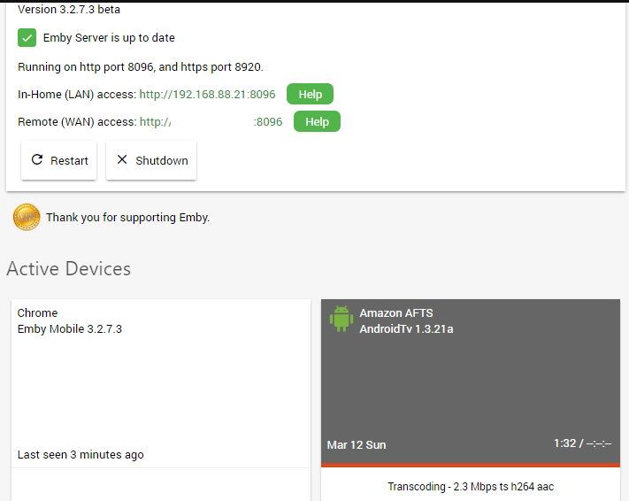 jclanton 1 Posted March 14, 2017 Posted March 14, 2017 I moved this post from Windows where I had accidently posted. Recorded NBC news tonight. On Amazon Fire, playback stutters constantly. It plays for about 15 seconds and then hangs up for 15 seconds. Repeatedly does this. The show is transcoding as can be seen in the attached screenshot: Server is Windows 10 i7 All in One hardwired running Beta 3.2.7.3 Amazon Fire is hardwired running Fire OS 5.2.4.0 Emby App is version 1.3.21a Played 60 minutes which recorded yesterday and it come up as Direct Play instead of transcoding and it worked perfectly. It also works perfectly on a wireless Firestick. When I connect to emby.media and sign in and watch same NBC news show, it works fine. Thanks in advance for your help ! Regular Log.txt transcode log.txt