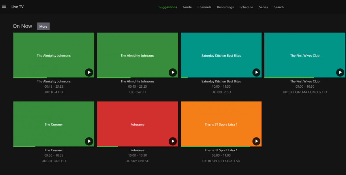 PrincessClevage 175 Posted June 4, 2017 Posted June 4, 2017 I'm currently setting up my new emby server and have added Live TV. All working fine except all shows are showing blank tiles rather than artwork show in some of the promotional articles etc. Attached a screenshot of what I am seeing. Can anyone provide any advice as to how I get it to look better? What tv tuner card/method are you using?