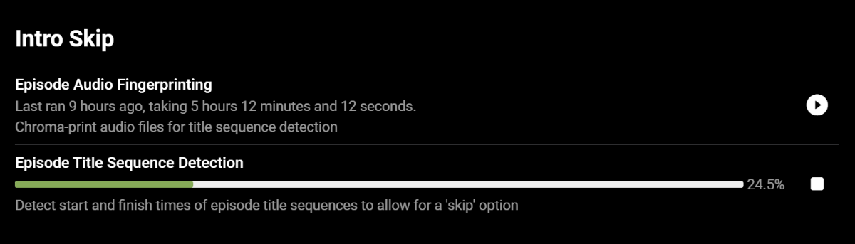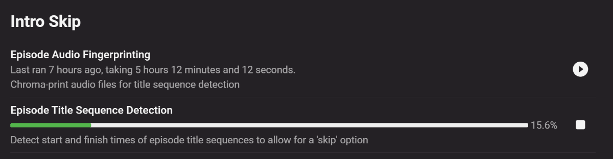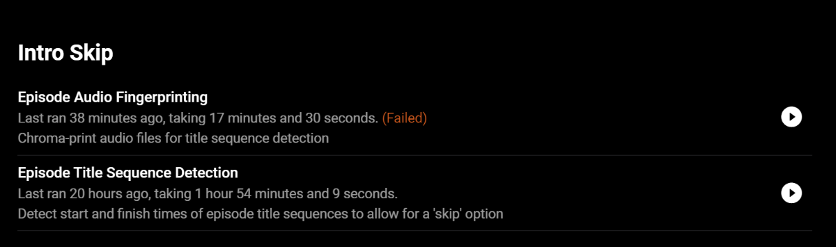 samuelqwe 317 Posted August 19, 2021 Posted August 19, 2021 (edited) @chef There's also another issue I've found, and it has to do with episodes that are shorter than the audio fingerprint length. I have certain shows that are only around 10 minutes long, and the intro data seems totally off with the default 20 minute audio fingerprint length. Presumably, this issue happens because the plugins assumes that the fingerprint will be 20 minutes long no matter what. So there will need to be a way to for the plugin to know that the audio fingerprint will not be as long in this case. Also, anytime you manually stop any of the tasks, they will show up as having failed and report an error. That probably shouldn't happen. Edited August 19, 2021 by samuelqwe