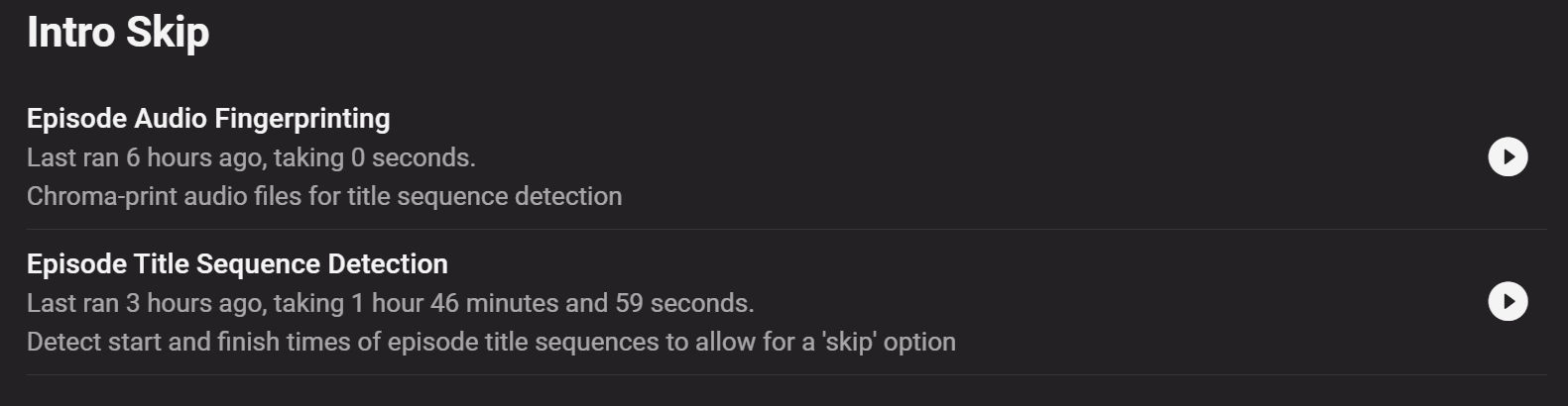 chef 3810 Posted August 23, 2021 Posted August 23, 2021 (edited) 1 hour ago, STR8 said: Not sure if this was done correctly @chef I stayed with the same plugin (didn't install any new version) Restarted the Emby server Where would I pull the required information that would be needed to compare? (out of the logs or ?) Also when I go into the plugin and advance setting it wont allow me to scroll down to see or access the other settings at the bottom of the page. (also I have tried opening the plugin in both Chrome and Microsoft edge and both are the same) Will run both the fingerprinting and detection again as I added new episodes for a couple of shows... thanks for your help in getting this done. I will fix the dialog. I must have left out the scrollY class. Nice catch! You would first run the fingerprinting task under scheduled tasks. I would install the most recent version of the plugin, because the database changed. Edited August 23, 2021 by chef