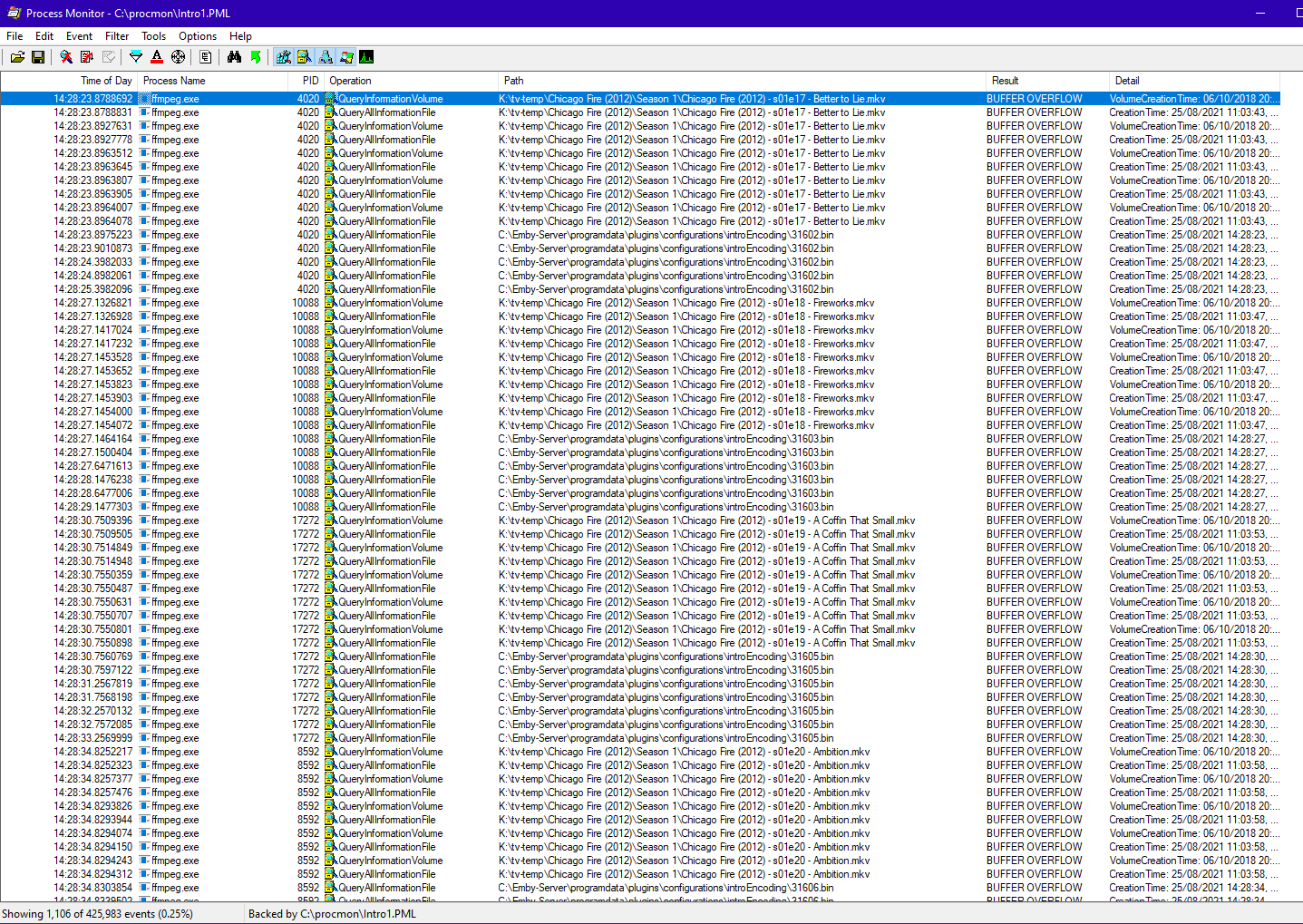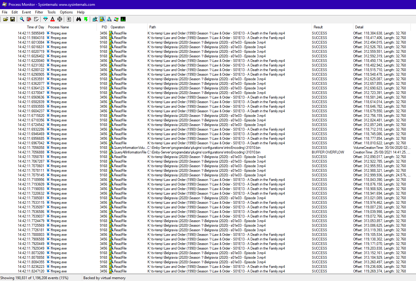 rbjtech 5284 Posted August 25, 2021 Posted August 25, 2021 So it's pretty easy to see why the I/O is getting hammered ! This was just running with 2 threads, and the reads are flipping between the two files with what looks to be 32K chunks ? Thus the HDD is seeking each time. Is there any way to read larger file chunks / increase the buffer size on the ffmpeg reads perhaps ? 1