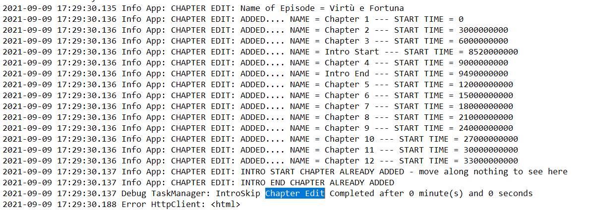 Cheesegeezer 3104 Posted September 9, 2021 Posted September 9, 2021 (edited) So Poker was cancelled tonight which is a shame, but it means i get a bit more time behind the laptop. I've done a little bit more work on the Chapters and it's working pretty good now. I don't know if we need to think of renaming the emby generated chapter numbers after removing the rogue one. We can see in the log below, I picked a good one and a bad one(a chapter was inbetween the introstart and introend) Episode: ChestNut Episode: Virtù e Fortuna Edited September 9, 2021 by Cheesegeezer 1