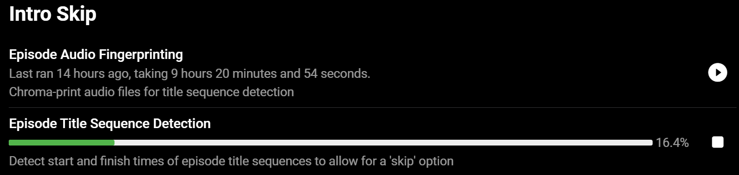 Cheesegeezer 3104 Posted September 10, 2021 Posted September 10, 2021 7 minutes ago, rbjtech said: This came up wayyy back on Page 30 () as a possibly implementation .. It cropped as as a consequence of the FP dB becoming huge (Multi Gb in size) resulting in long dB lookup times. Chef then made changes to remove the FP data once the Detect for the Season had been successfully completed - ie you don't need the FP data anymore. I then suggested, as you have, why not round robin the tasks to do an FP for a show, then a Detect for a show (and now maybe a Chapter for a show) and then process the next show. This will not only will keep the FP Database size in check, but as you say, people will 'see' full results on shows that have been processed without completing the entire task. You can do this manually - simply by limiting the task to X minutes (ie interval) and move onto the next scheduled task, but it's messy. The good news is IntroSkip doesn't forget what it did - and will gracefully carry on post a resume - but it does seem a very unorthodox way of doing it vs doing it a show at a time. Anyway - let me test the latest - haven't had a chance to even load it up yet ! If your fingerprinting and detection is already done, you just need to run the chapters and the thumbnail extraction tasks 1