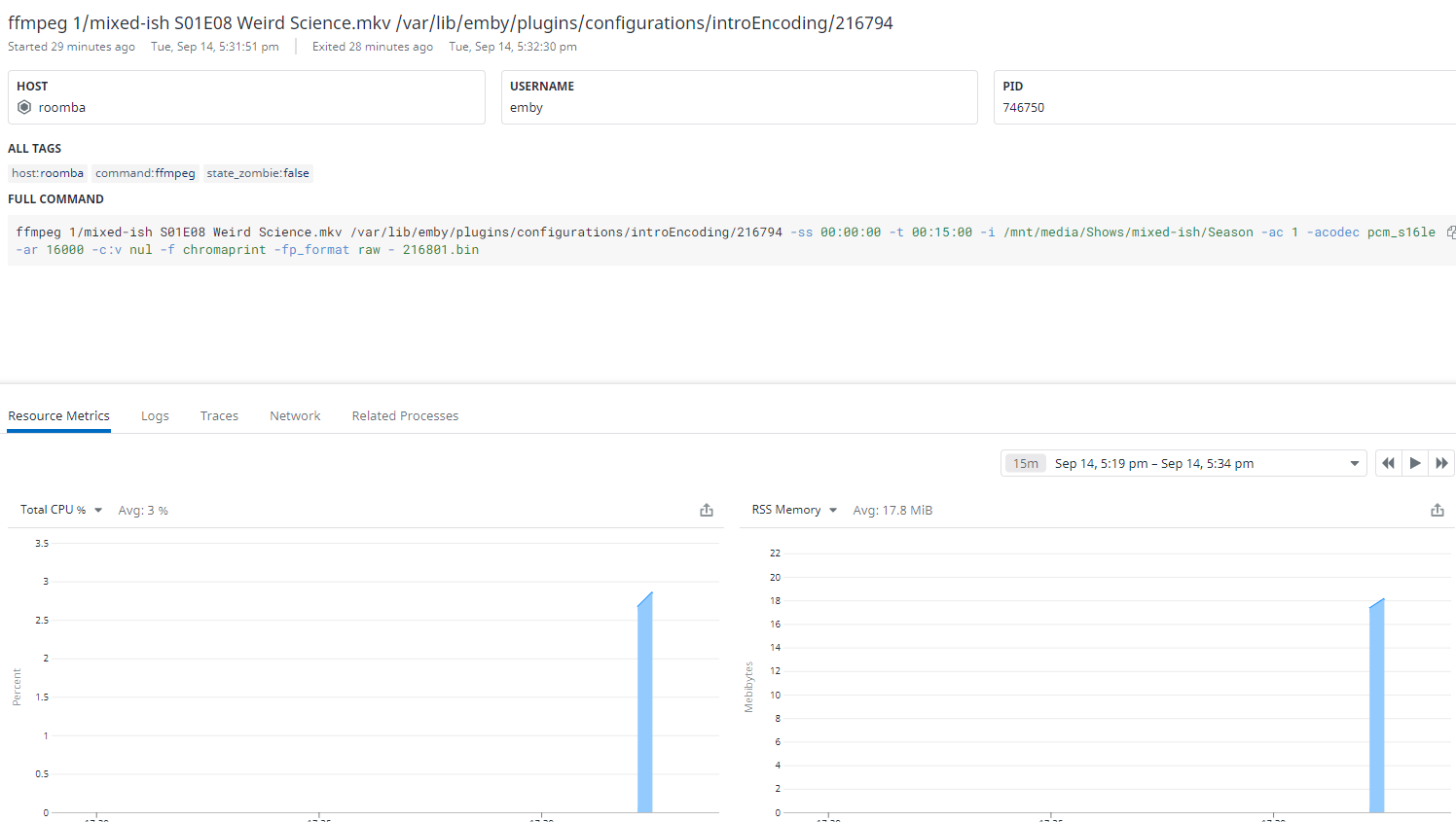jad3675 26 Posted September 14, 2021 Posted September 14, 2021 I'm running the latest release against my library, performing the initial finger print. I have process monitoring working through datadog, and you can see here that a 30 minute show took 20 seconds to run through and didn't consume much in the way of proc or memory. Granted, that's a simple 720p OTA recording done over an rclone mount, but it shows efficient it can be. Good job guys. I'm impressed by everything you've done in this thread. 3