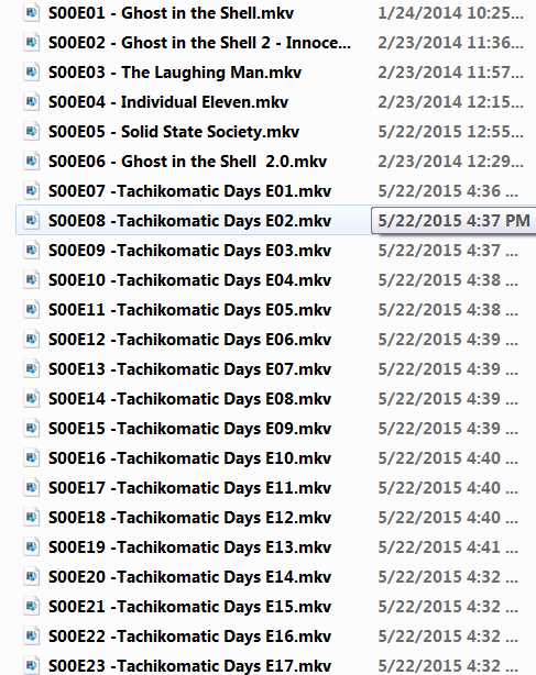 Karnov 1 Posted June 27, 2017 Posted June 27, 2017 I've been pulling my hair out trying to get emby to match the special episodes for Ghost in the Shell: Stand Alone Complex. I have all of the Tachikomatic Days special episodes from season 1 and 2. Here is an example of how they are named in my folder structure: GHOST IN THE SHELL - STAND ALONE COMPLEX SEASON 00 (SPECIALS) "0x07 - Tachikomatic Days EP01" "0x08 - Tachikomatic Days EP02" "0x09 - Tachikomatic Days EP03" ... "0x34 - 2nd GIG Tachikomatic Days EP01" "0x35 - 2nd GIG Tachikomatic Days EP02" "0x36 - 2nd GIG Tachikomatic Days EP03" etc. These filenames correspond exactly to the episode names on thetvdb, and in fact the files were named by Sonarr when it scraped the info from thetvdb. Now for some reason I just could not get emby to see any of them as the correct episodes. The first six episodes (0x07 to 0x12) showed up as ghost in the shell movies. Well 0x01 to 0x06 on thetvdb are ghost in the shell movies, so for some reason emby was ignoring that the files were named starting with 0x07 to 0x12 and was labeling them as 0x01 to 0x06. I finally figured out what the problem is. See how the name of each episode ends with "EP01" or "EP02" etc? Well this bit of text at the end of the filename was overriding the 0x07 at the start of the filename. Once I renamed the files as, for example, "0x07 - Tachikomatic Days 01" (removed the EP) then did a metadata refresh the problem was solved. Yay! It took me days to figure out what the issue was, even though it is kinda obvious now. So although there is a workaround, I would consider this a bug. If not a bug then just very annoying behaviour! P.S. Thanks Emby team, I love Emby + Kodi and prefer it to Plex + Kodi any day of the week.