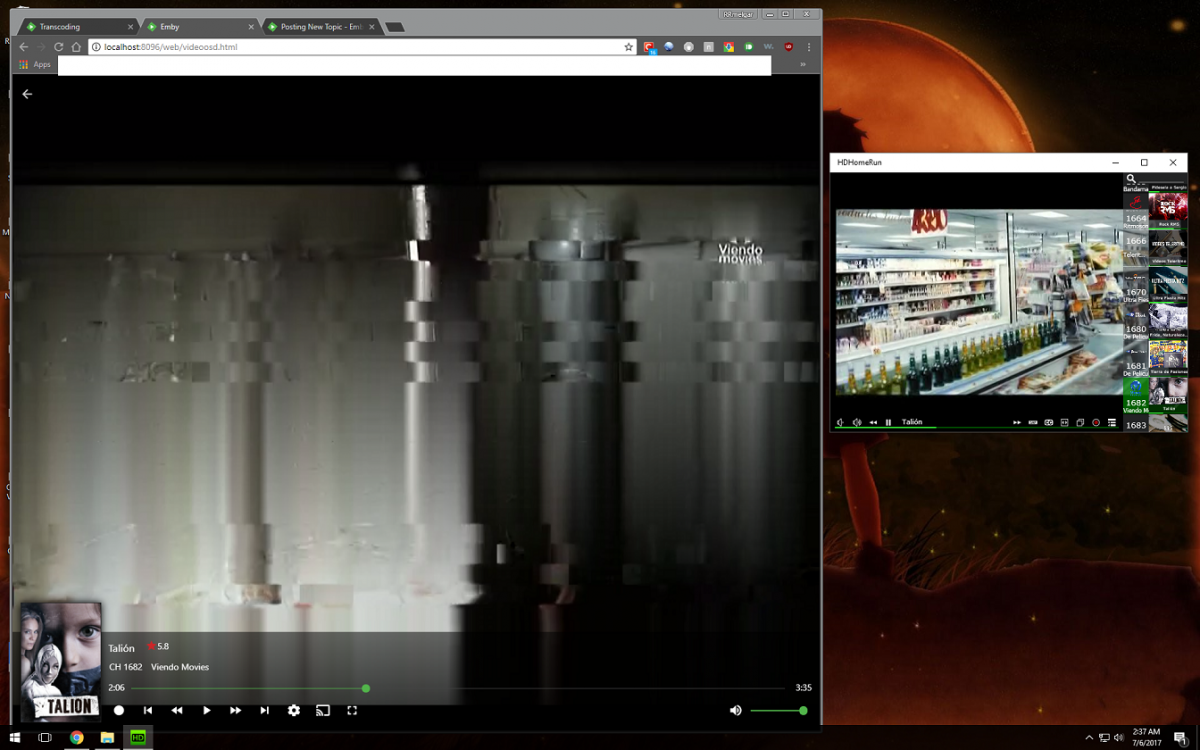 rrmelgar 0 Posted July 6, 2017 Posted July 6, 2017 (edited) having this issue with this channel on emby maybe an issue with transcoding but i also tested with no hardware acceleration and there no difference. I tried on chromecast on iphone and on the same server emby on chrome still broken the issue the stream comes in broken and no matter how long i wait it does not clear "same channel " as u can see it plays fine software HDhomerun left side and emby on the right and it also plays fine on my DLNA tv streaming it straight from hdhomerun wondering if anyone can take look at log maybe as i don't understand it very well i do see couple of errors but don't know where problem maybe FIOS tv emby log.txt Edited July 6, 2017 by rrmelgar
