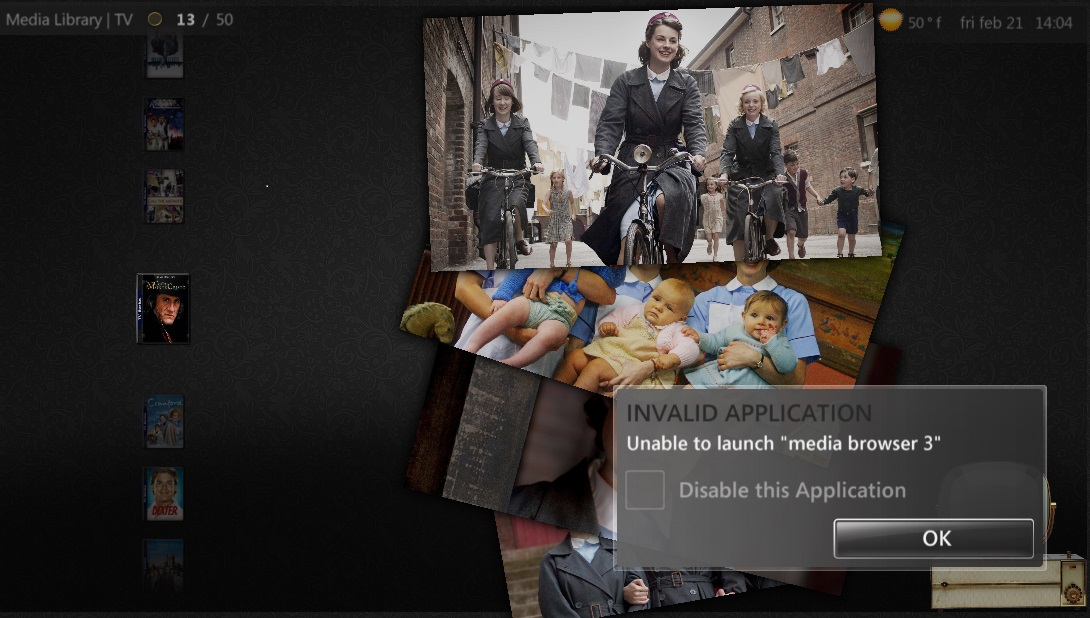 iam4uk 26 Posted February 21, 2014 Posted February 21, 2014 Having received feedback that some earlier Aztec problems were resolved, I updated and tried it again. I am encountering a new, repeatable, crash-causing bug. Within my "TV" item of my Media Library, while using the Thumb Strip view (only Aztec view I use, except Detail for "Music"), scrolling through the items in the library causes MBC to crash and report "Invalid Application - unable to launch 'Media Browser 3.'" This is the only time I have seen this error WITHIN the application; it has sometimes happened when trying to launch it. Screenshot attached. MB Server version 3.0.5135.31685 MB Classic version 3.0.129.0.2-12.2 Themes: Aztec 1.0.4.1, Breeze 1.0.12.0, Chocolate 3.0.4.1, Crystal 1.0.10.2, ROC 1.0.10.2, Subdued 3.0.1.13 Windows 7x64 Home Premium SP1 updated through 2/13/2014 patches