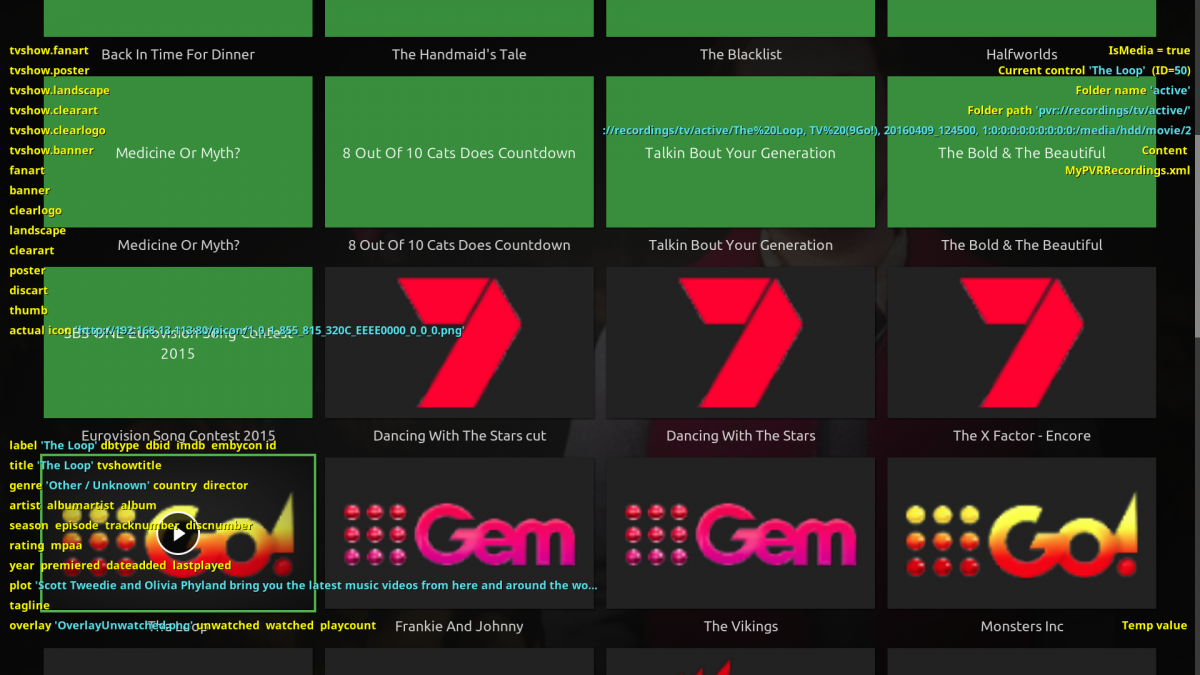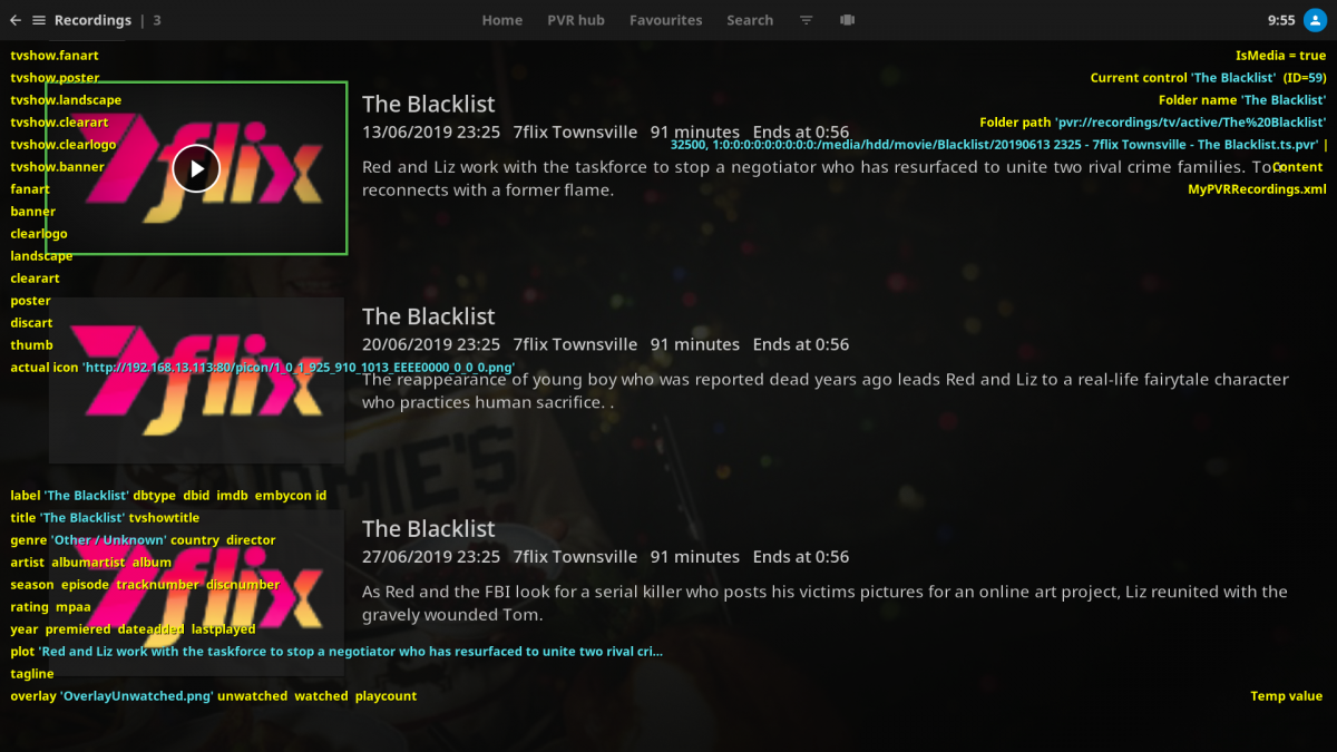 quack 1 Posted June 28, 2019 Posted June 28, 2019 Do me a favour and make me a screenshot: Enable the debug overlay again and focus one of the recording items with missing cover. screenshot005 shows an episode of The Blacklist highlighted with the debug overlay active. screenshot006 shows the artwork known to Kodi when I activate the context menu for that episode and select "Artwork options" followed by "Manual configure artwork". As you can see, Kodi knows about artwork for The Blacklist. I notice that none of these are exposed to the debug overlay which only identifies "actual icon" as being the channel icon. For completeness I include the virtual folder (group) created for The Blacklist episodes being highlighted as well; shown in screenshot007. Similar to each episode, the artwork exists through the "Artwork options|Manual configure artwork" but is not exposed to the debug overlay.