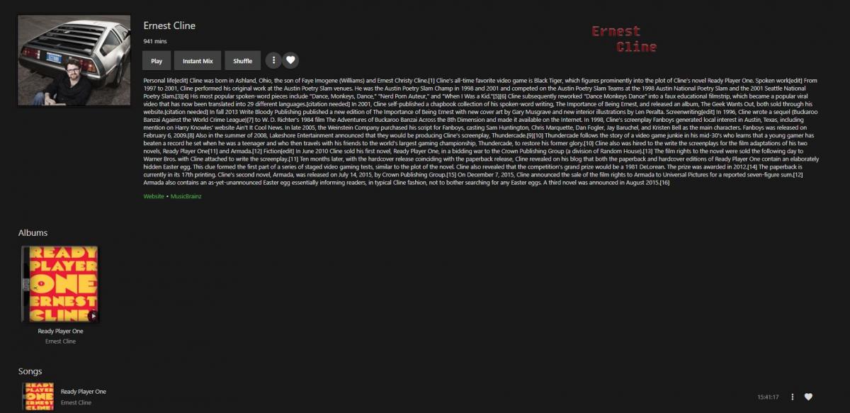firestorm213 6 Posted September 7, 2017 Posted September 7, 2017 I'm be curious to hear from the rest of the community as to rather they would like this as well. I once had all my audio books under the content type of music.The cool thing about this is it treats each author as an artist and allows for the storage of info about the author. This is obviously a manual process but I like having info about the author so my wife and kids can read about the type of books the author writes before diving into an audio book. The other neat thing is occasionally MusicBrainz occasionally picks up the meta data for the book. (see attached) So to my request: I'd like to have the option to store/display meta data for authors and books with audio book content type. I understand this would be a mostly manual process but it's worth the trouble to me. The other issue I've ran into with the audiobook content type is the web version of emby and emby theater play from where I left off without issue but the android mobile app always starts back over from the beginning. Not sure how much of an endeavor this is. 2