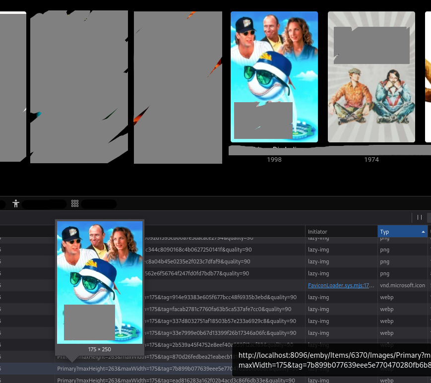 DragonEmbers 0 Posted April 14, 2023 Posted April 14, 2023 Sorry to open an old thread, but this still appears to be an issue. The source image size: 680x1000 The URI emby uses to get the image has "maxHeight=267&maxWidth=178" (so 178x267) The container the image is being loaded into is (on my screen, standard size of everything): 176.3x264.45 (when using "Extra large", the container size is: 274.83x412.25) The fetched image, scaled by emby, returns a nice clear image, however when displayed in the container, there is a blurring that occurs due to that tiny difference. I believe the culprit CSS is: .coveredImage { object-fit: fill; } because once it is removed (thank you console...) there isn't any blurring of the images (although they do shrink from the container a little). The alternative is to use a larger image than the container (say 1.5x) which also prevents the blurring. I'm guessing its all to do with the browser scaling method?? A couple of offenders attached as an example. They might not bother some people, but they jank my eyes something horrid. Spoiler Blurred is on the bottom