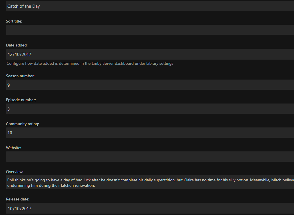 georgewill76 14 Posted October 11, 2017 Author Posted October 11, 2017 Sever: 3.2.33.0 Movie Plugin: 17.10.6.937 TV Plugin: 17.10.6.848 It seems like it's doing its job as I can see the tv show/movie being rearranged when I go to emby homescreen and see the item in latest section moved from the beginning of list moved accordingly based on date released but the info it shows for tv/movie when I choose edit info shows the date added as being when I scanned the file into emby. It fixes itself if I reinstall both plugins.