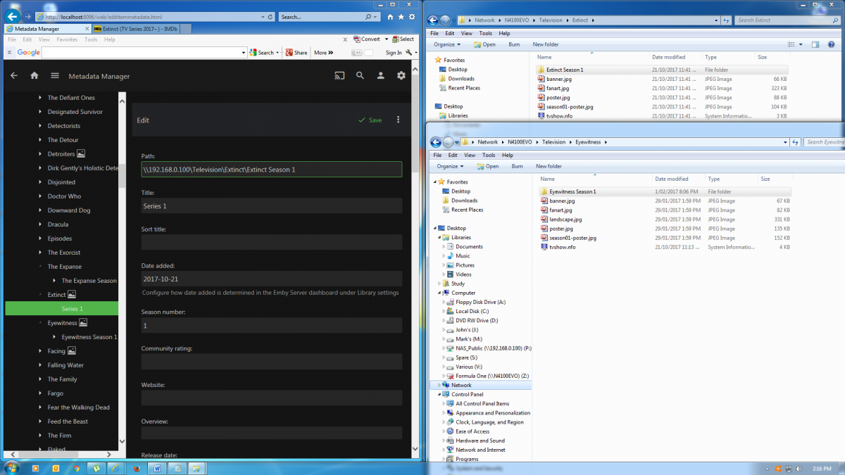 kanipek 230 Posted October 21, 2017 Posted October 21, 2017 (edited) Hello all, I have a minor issue whereby the naming of my season folder all of a sudden does not seem to not be recognised. For example, I would name a season folder, "Example Season 1". This would normally replicate itself into the meta data section of emby, and also into KODI. But for some reason, the name of the TV Series "Example Season 1 Folder" is not being picked up, and it now only shows as Season 1, minus the name of the show. This has only happened recently, as in the picture you can see older folders still have the Name of the TV shows for each of the folders season. Cheers Mark Season Nameing Convention.png I think the way to name/organize series with the least amount of problems is: \seriesnamefolder \Season 01 \seriesname.episodenumber.episodename.mp4 \Season 02 Personally I use a slightly different format: \TV Shows \0-D<<--- This is where I add to the Emby library \seriesnamefolder \Season 01 \Season 02 \E-H .....and so on Gives a little more organization when dealing with windows explorer. No issues with Emby/metadata with this structure. Edited October 21, 2017 by kanipek