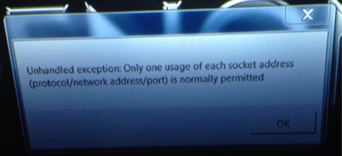 pd veeps 2 Posted March 3, 2014 Author Posted March 3, 2014 (edited) There are 2 logs. One at 9:02:47 and the second and 9:02:54 this morning. " Cannot access a disposed object. Object name: 'System.Net.Sockets.Socket'. System.ObjectDisposedException at System.Net.Sockets.Socket.BeginAccept(Socket acceptSocket, Int32 receiveSize, AsyncCallback callback, Object state) at System.Net.Sockets.Socket.BeginAccept(AsyncCallback callback, Object state) at System.Net.Sockets.TcpListener.BeginAcceptTcpClient(AsyncCallback callback, Object state) at Alchemy.TcpServer.Listen(Object state) at System.Threading.QueueUserWorkItemCallback.WaitCallback_Context(Object state) at System.Threading.ExecutionContext.RunInternal(ExecutionContext executionContext, ContextCallback callback, Object state, Boolean preserveSyncCtx) at System.Threading.ExecutionContext.Run(ExecutionContext executionContext, ContextCallback callback, Object state, Boolean preserveSyncCtx) at System.Threading.QueueUserWorkItemCallback.System.Threading.IThreadPoolWorkItem.ExecuteWorkItem() at System.Threading.ThreadPoolWorkQueue.Dispatch() at System.Threading._ThreadPoolWaitCallback.PerformWaitCallback() " " Only one usage of each socket address (protocol/network address/port) is normally permitted System.Net.Sockets.SocketException at System.Net.Sockets.Socket.DoBind(EndPoint endPointSnapshot, SocketAddress socketAddress) at System.Net.Sockets.Socket.Bind(EndPoint localEP) at System.Net.Sockets.TcpListener.Start(Int32 backlog) at System.Net.Sockets.TcpListener.Start() at Alchemy.TcpServer.Listen(Object state) at System.Threading.QueueUserWorkItemCallback.WaitCallback_Context(Object state) at System.Threading.ExecutionContext.RunInternal(ExecutionContext executionContext, ContextCallback callback, Object state, Boolean preserveSyncCtx) at System.Threading.ExecutionContext.Run(ExecutionContext executionContext, ContextCallback callback, Object state, Boolean preserveSyncCtx) at System.Threading.QueueUserWorkItemCallback.System.Threading.IThreadPoolWorkItem.ExecuteWorkItem() at System.Threading.ThreadPoolWorkQueue.Dispatch() at System.Threading._ThreadPoolWaitCallback.PerformWaitCallback() " Edited March 3, 2014 by pd veeps