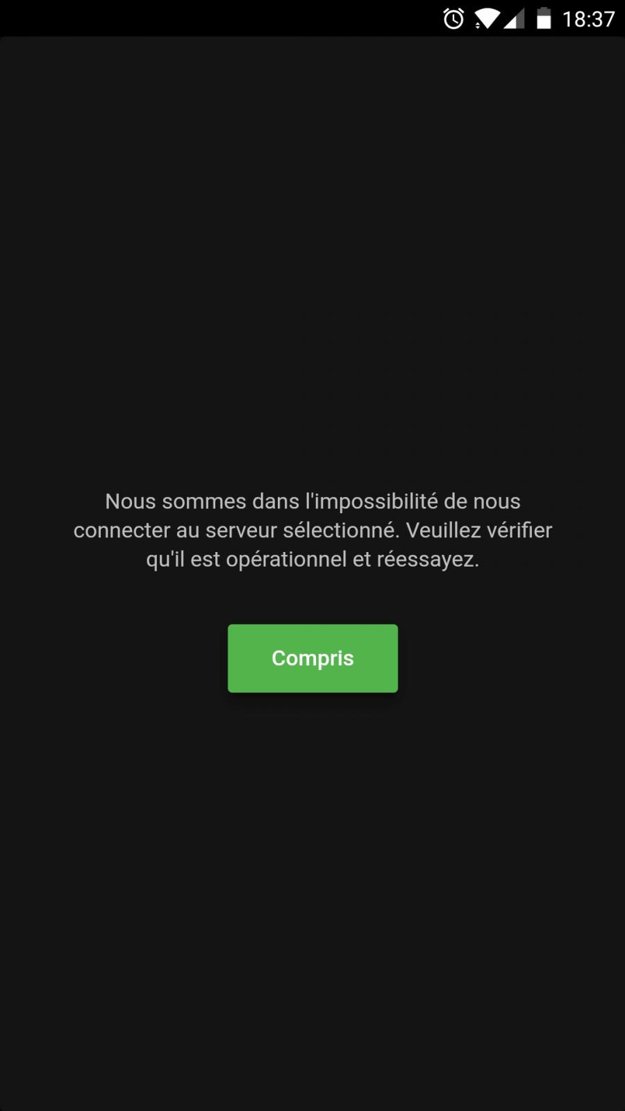 mattaleis 0 Posted November 14, 2017 Posted November 14, 2017 Hello, On Android App, (Oneplus5) when i try to connect to the server i got an error message (attached screen in french) that say : We have not the possibility to connect to the selected server. Please help !