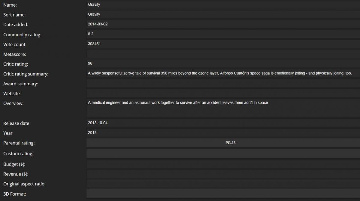 Mopar_Mudder 14 Posted March 6, 2014 Author Posted March 6, 2014 (edited) Well I am not sure what I learned here Problem is that I am trying to play a intro based on aspect ratio with MB Intros and MB Theater. But I just looked at a movie we watched last night and Media Browser is showing an aspect ratio under original aspect ratio, and no intro played. The night before we watched Gravity and Media Browser shows no aspect ratio in the library GUI (screen image attached), but if I go into Meta Browser it is their, so I assume it is in the metadata. I don't know if it is related but I also saw a movie last night that doesn't list the length of the movie, I don't even see an entry for it in the Media Browser Library Edited March 6, 2014 by Mopar_Mudder
