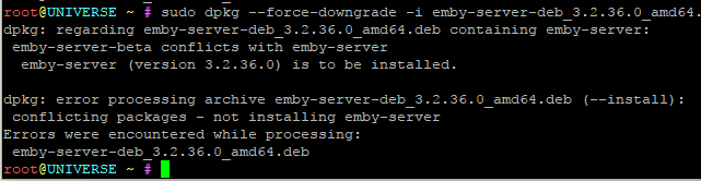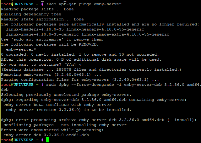 tdiguy 99 Posted November 29, 2017 Posted November 29, 2017 (edited) Normally for me i have been able to switch versions just using dpkg, but i also have not installed using the repository on this system at all. It might be a good idea for you also, i suspect installing using the repository makes it more difficult to revert without wiping out the emby server. It is slightly more work but you can check the site: https://github.com/MediaBrowser/Emby/releases for updates then download them on the server and install with dpkg -i I suspect if you dont use the repo that you can probably switch versions with ease, I myself run ubuntu 16 and that is how i change versions. Edited November 29, 2017 by tdiguy