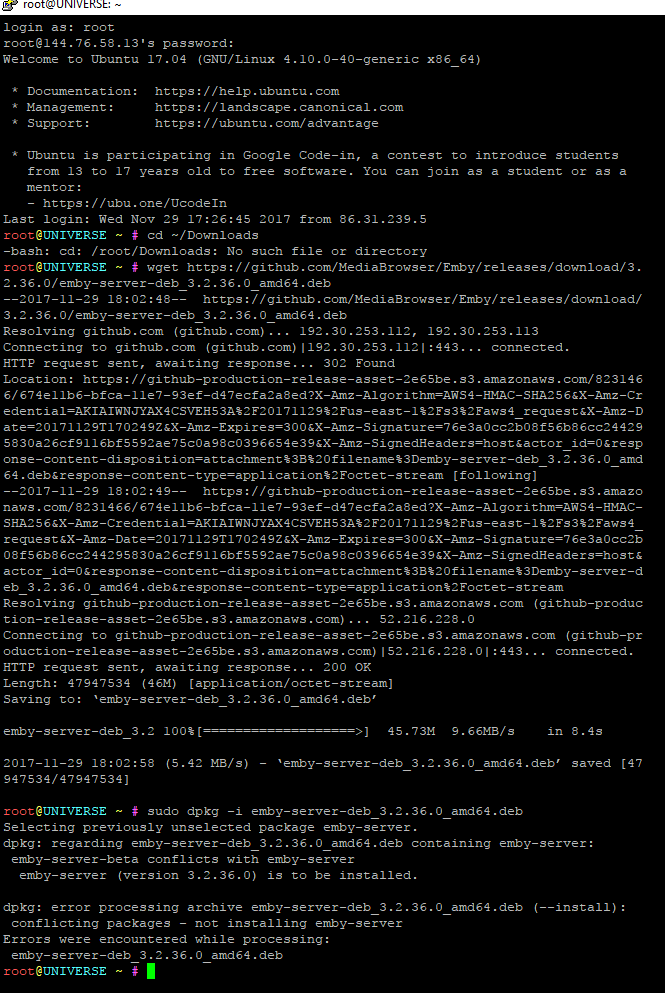 tdiguy 99 Posted November 29, 2017 Posted November 29, 2017 You will need to do the following. cd ~/Downloads wget https://github.com/MediaBrowser/Emby/releases/download/3.2.36.0/emby-server-deb_3.2.36.0_amd64.deb sudo dpkg -i emby-server-deb_3.2.36.0_amd64.deb