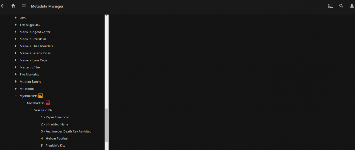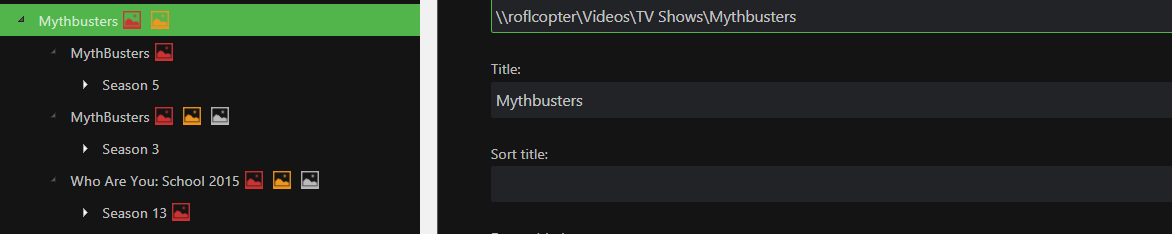 BenDover 3 Posted December 5, 2017 Author Posted December 5, 2017 (edited) OK, I'll try and explain it maybe a bit differently. Its hard to get those gigantic snippets. image 6.jpg is a library image where you go down to the M's and the two mythbuster posters are next to each other. The first contains a lot of the seasons but have problems of their own and the second with the orange background with "MythBusters" in white lettering has one season by itself. If you look at 6-1.jpg, we're currently looking at seasons, 1, 2, 4-12,14. If you look after the season 2 poster, there is no season 3 which will be found in the second folder (Orange background White Lettering with the word "Mythbusters"). The rest of the seasons up until we hit season 13 are listed with what i believe is the correct metadata. In image 6-2.jpg, we only have season 3. For some reason this decided it was going to separate itself from the others. Season 13 got classified as "Who are you: School 2015".. Edited December 5, 2017 by BenDover