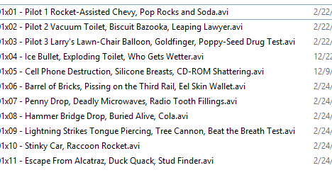BenDover 3 Posted December 5, 2017 Author Posted December 5, 2017 The first season of Mythbusters. 1x01 - Pilot 1 Rocket-Assisted Chevy, Pop Rocks and Soda etc.