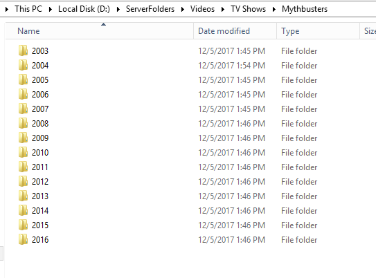 ClassH 0 Posted December 5, 2017 Posted December 5, 2017 (edited) I'll hop in here and give you a reference for the way Emby is correctly working on my machine for this. At some point the TVDB switched from seasons to years for Mythbusters. I am guessing his wont pick up the new settings and keeps loading the old for some reason even though his folders seem to be correctly named. Attached is how mine picked up after naming the folders by years. Edited December 5, 2017 by ClassH