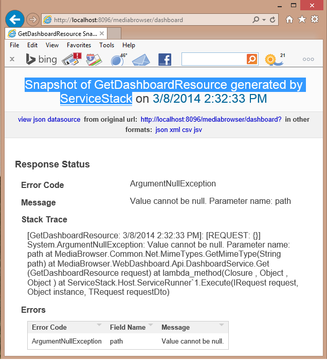 Chuck 17 Posted March 8, 2014 Posted March 8, 2014 Not a huge bug, but an exception handling challenge. Please see attached screen shot image taken from entering http://localhost:8096/mediabrowser/dashboard without complete URL or parameters.
