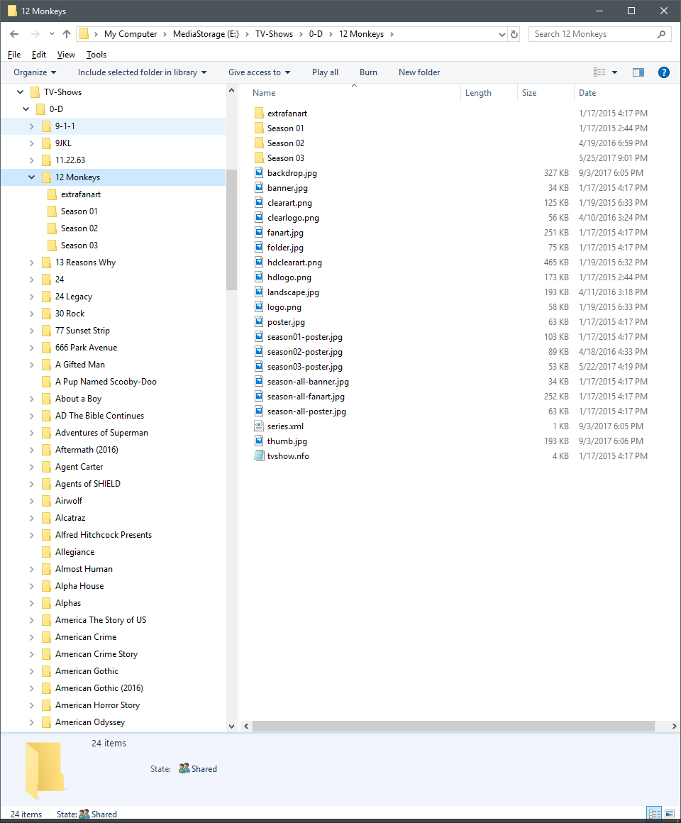 ebr 16184 Posted January 15, 2018 Posted January 15, 2018 Okay, there are a number of different physical structures involved here. In that last one, it is going to be a problem because there is no parent folder containing all of the series folders and adding the root of the share will cause problems with the other (non series) items at that level. I would suggest you grab all those series folders and move them under a single folder and then point a library to that one folder. If you haven't been there, please check out: TV naming