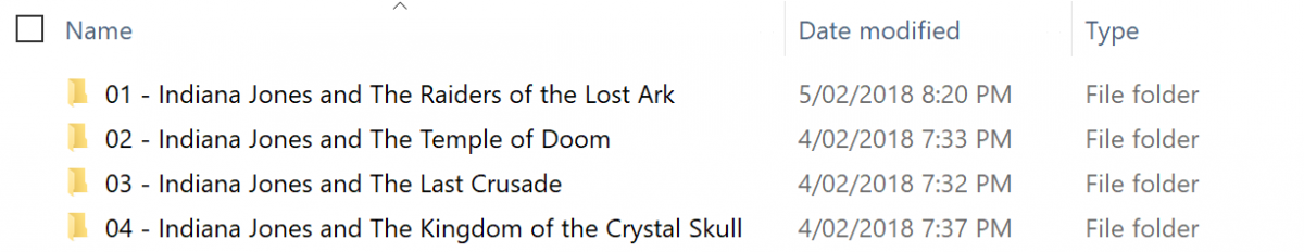 Dewey80 7 Posted February 5, 2018 Posted February 5, 2018 Hey guys, I have a question on how everyone handles the folder naming structure for boxsets. I understand that on the server side the auto-boxset does a great job of clustering movies, and I really like this feature when I have a few movies that go to together. But the, somewhat, OCD side of me likes to keep some order in the back-end, in case I actually go looking in File Explorer, and thus for boxsets like James Bond, or Indiana Jones I keep them in a folder. But because I prefix the folder to ensure they are displayed inorder emby doesn't auto-identify it as it takes the file name and not the file name... I've attached the folder structure of one example, Indie; These 4 folders are in the parent folder named 'Indiana Jones [Multi]': And here is the output from Emby, showing it unable to match: Is there a way for me to keep this structure and have emby identify the movies... say for instance, with ignoring special characters like []... ie [1], [2], etc? For Boxsets like James Bond, where there is 24 movies, I kinda want to be able to keep some structure to it! Cheers for your inputs, Dewey