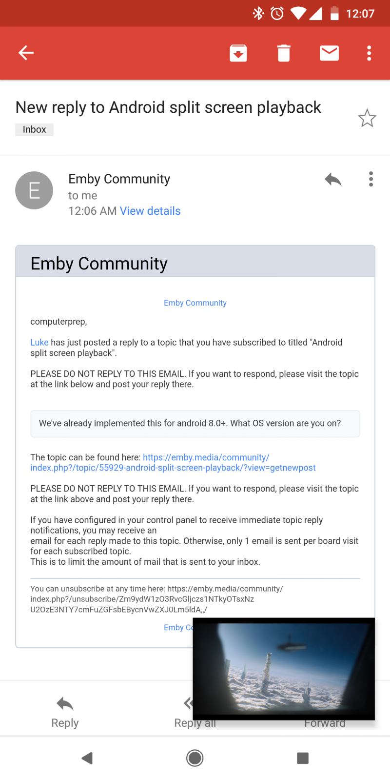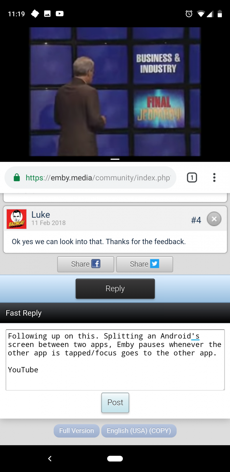 computerprep 148 Posted June 7, 2019 Author Posted June 7, 2019 Following up on this. Splitting an Android's screen between two apps, Emby pauses whenever the other app is tapped/focus goes to the other app. YouTube works perfectly in this split app mode. So it's not an Android limitation. YouTube is actively playing while typing this response in the screenshot below.