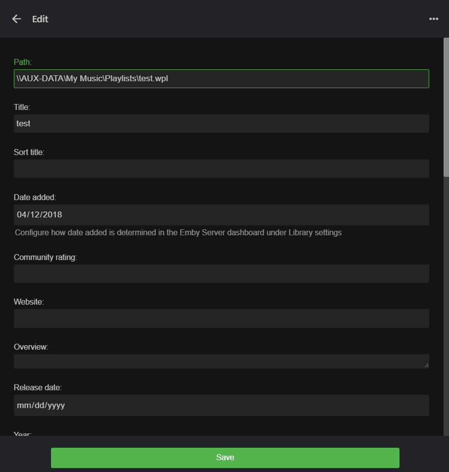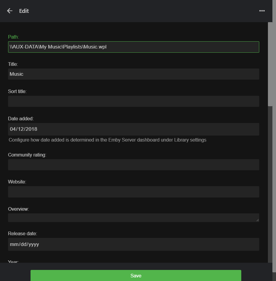 tuvx 14 Posted April 13, 2018 Author Posted April 13, 2018 (edited) I attached screenshots, which show exactly what I stated. Please let me know if you need more information. Also, I do not have Windows Media Player installed on my server. Below is the content of the wpl files: <?wpl version="1.0"?> <smil> <head> <meta name="Generator" content="Microsoft Windows Media Player -- 12.0.7601.17514"/> <meta name="ItemCount" content="0"/> <title>Test</title> </head> </smil> <?wpl version="1.0"?> <smil> <head> <meta name="Generator" content="Microsoft Windows Media Player -- 12.0.7601.17514"/> <meta name="ItemCount" content="0"/> <title>Music</title> </head> </smil> embyserver-63659087996.txt Edited April 13, 2018 by tuvx