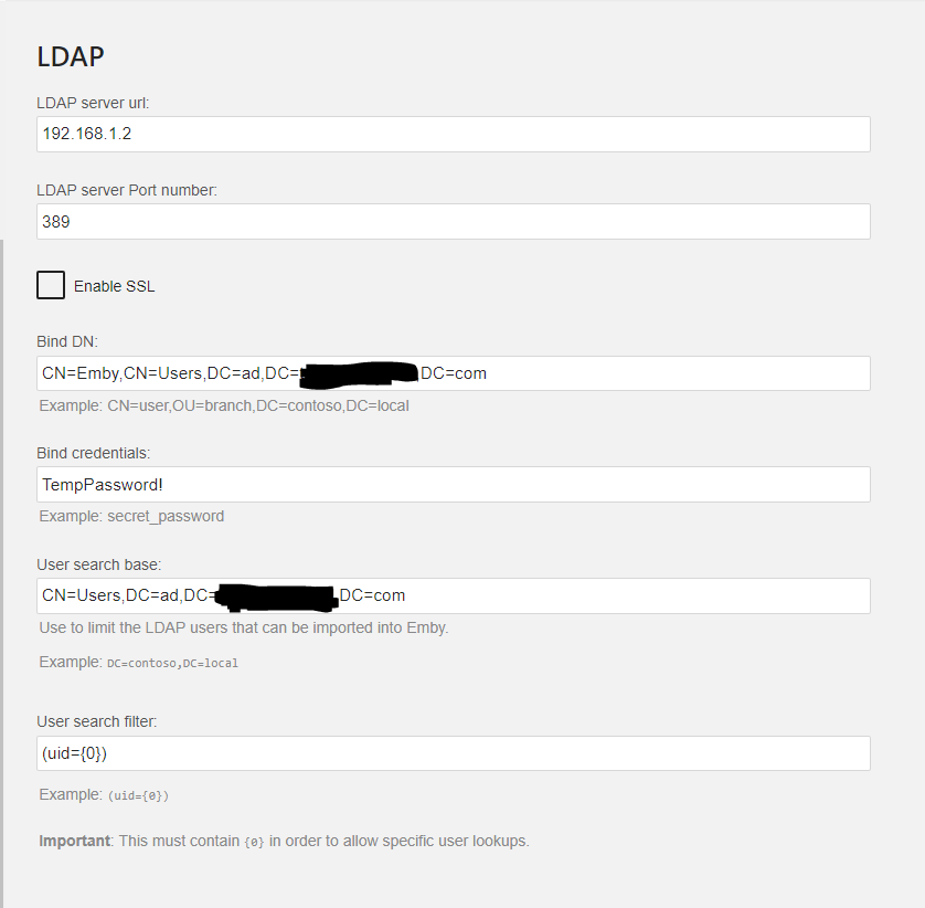 jthomelab 0 Posted August 3, 2018 Posted August 3, 2018 I'm having a hard time getting Emby to connect with LDAP through Active Directory. I created a user to use as the Bind DN with a password using no SSL and the default ldap port of 389 (screenshot attached), but when attempting to log in with that very same user (which I've verified can log into the domain), I get the "Invalid username or password. Please try again" message. Looking at the logs, it sayd that it's an error authenticating with provider LDAP: 2018-08-03 10:55:40.158 Error UserManager: Error authenticating with provider LDAP *** Error Report *** Version: 3.5.2.0 Command line: C:\Users\administrator\AppData\Roaming\Emby-Server\system\EmbyServer.dll -noautorunwebapp Operating system: Microsoft Windows NT 6.2.9200.0 64-Bit OS: True 64-Bit Process: True User Interactive: True Processor count: 5 Program data path: C:\Users\administrator\AppData\Roaming\Emby-Server\programdata Application directory: C:\Users\administrator\AppData\Roaming\Emby-Server\system System.Exception: Login failed - user not found. at LDAP.AuthenticationProvider.Authenticate(String username, String password) at Emby.Server.Implementations.Library.UserManager.AuthenticateWithProvider(IAuthenticationProvider provider, String username, String password, User resolvedUser) System.Exception at LDAP.AuthenticationProvider.Authenticate(String username, String password) at Emby.Server.Implementations.Library.UserManager.AuthenticateWithProvider(IAuthenticationProvider provider, String username, String password, User resolvedUser) Am I missing something in the setup? The only thing I've obfuscated in the log is my domain name. This is running on Server 2016, and I'm not sure if that causes any problems.