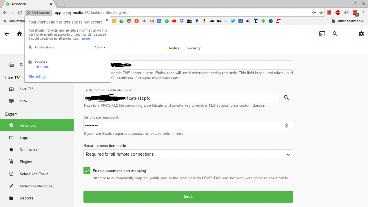 Happy2Play 9780 Posted September 6, 2018 Posted September 6, 2018 Connect is a alternative to your DDNS/WAN address there is nothing you need to enable. Either use https://app.emby.media or use your WAN address. Connect plays by its own rules. I just logged in with http://app.emby.media and when adding my server I was forced to add my https://WAN address and port, http would not connect. But the browser will always show unsecure unless you sign into Connect on https address.