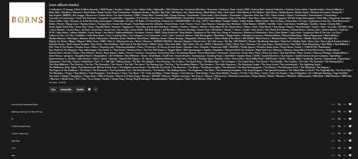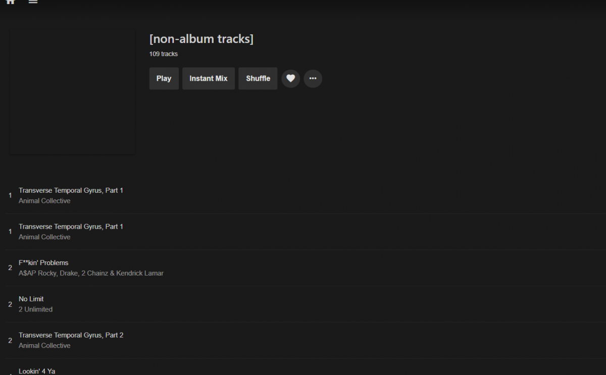 nmkaufman 50 Posted October 18, 2018 Posted October 18, 2018 (edited) Has anyone had any luck organizing non-album tracks in Emby? Physically, my files are organized like so: >Music >>[non-album tracks] >>>"Band 1 - Song 1" >>>"Band 1 - Song 2" >>>"Band 2 - Song 1" >>Band 1 >>>Album 1 >>>>"Album 1 - Song 1" >>>>"Album 1 - Song 2" >>>Album 2 >>>>"Album 2 - Song 1" Now if I tag my non-album tracks with an album artist, I end up with 100's of seperate non-album track albums. If I tag my non-album tracks without an album artist, I end up with a massive album with 100's of contributing artists. The second scenario is closer to what I want, but nowhere does it tell me who the artist of each song is. My description of things stinks, so I've attached a picture. You'll see that the longs are listed, but with no artist. What's the solution? Thanks in advance. Edited October 18, 2018 by nmkaufman