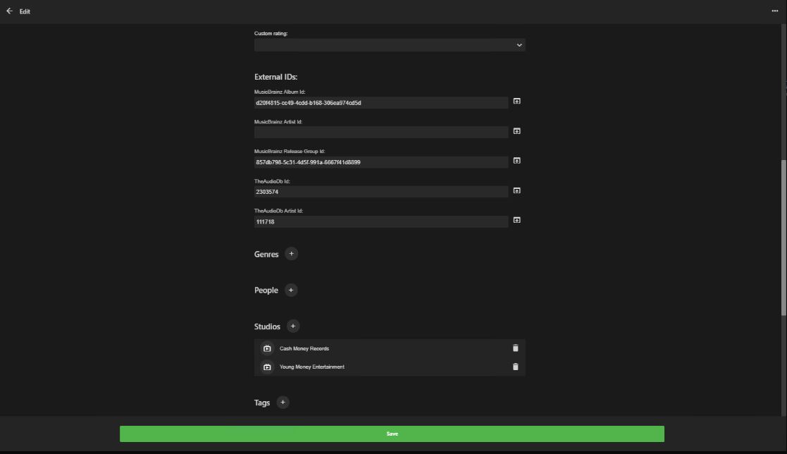 screwfaze 38 Posted October 30, 2018 Author Posted October 30, 2018 Please see screenshot from Emby I tagged this with Musicbrains but on Emby has no Genre. This is the same for hundreds of Albums I have. Thanks